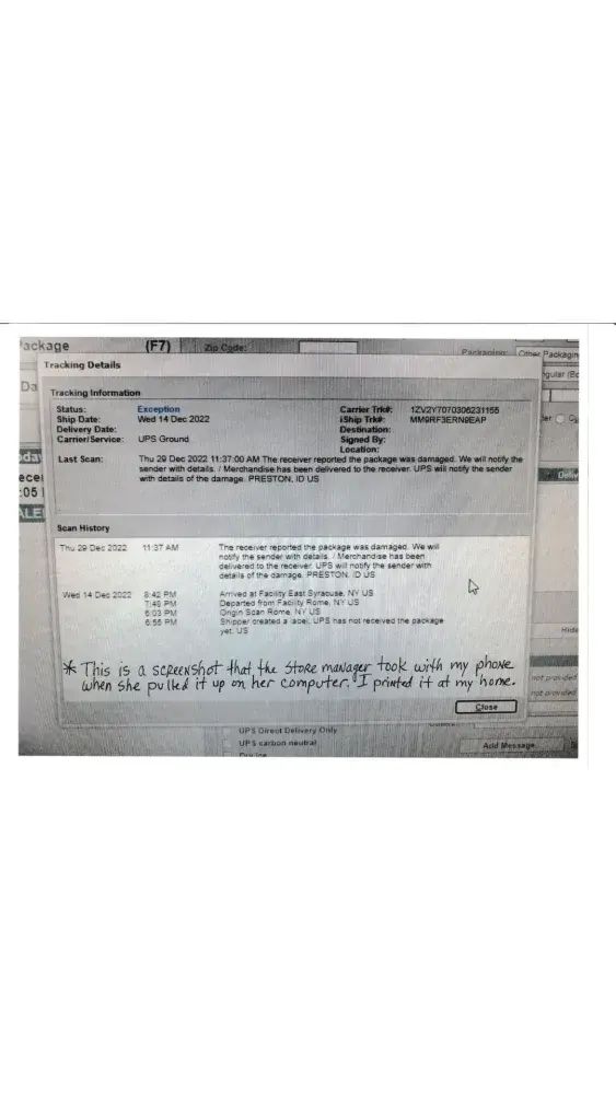 On December 14, 2022 at 11:33 am, I went to our local UPS store in Rome NY to ship a piece of art to a customer in Preston ID. Estimated delivery was set for 12/21/22. I contacted my customer on 12/22/22 to ask if it was delivered to her and it was not. I went on UPS tracking and noticed that the package had not been tracked past the UPS facility in East Syracuse NY, arriving at that facility at 8:42 pm on December 14th. I returned to the UPS Store asking them to please find out what the problem could be, but instead the store manager suggested that I file a claim. She proceeded to do that at the store. I provided her with my email address, a photo of the artwork which is a hand painted antique saw blade, proof of the cost of the blade, and my shipping receipt. I was not given a copy of any paperwork or even a claim number, nor have I ever received any email regarding my claim status. One associate did give me two phone numbers of the East Syracuse facility, but after trying several times to get someone to answer was unsuccessful. I came back to the store on December 29th to ask if there had been any updates and the manager pulled up the tracking number. The update was written as follows: