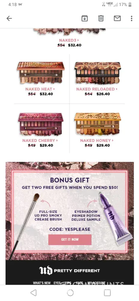 I received an email advertising their palettes on sale. I purchase 2 to get to my over $50.00 min purchase to receive 2 free gifts. Shipment was split into 2 different packages. Never received the makeup brush, after 30 minutes and 3 different calls I was told I will not be getting the brush...No substitution or anything just SOL. Terrible customer service, and based on the other reviews Im not the only one with issues..Buyer beware and I will be checking other makeup brands before my next purchase.