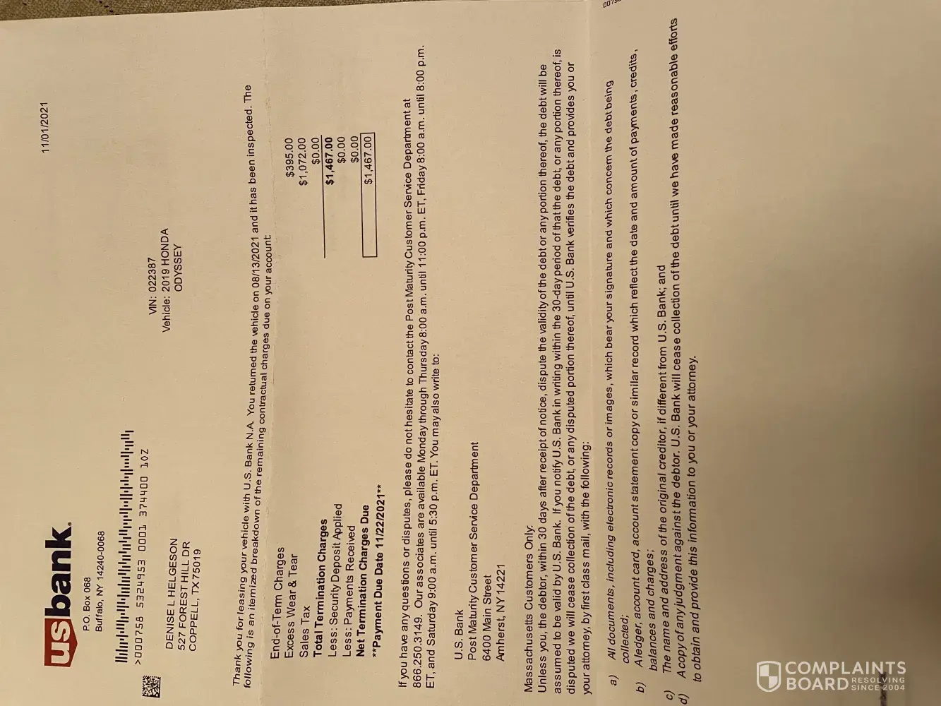 I have leased cars for 14 years without one problem. Honda sub-leased my van through USBank (3 years ago) and the van was returned this year. I received a bill claiming I owed $1, 467.00 in "excessive wear and tear" to the vehicle. The van barely had 20, 000 miles on it after 3 years and the original floor mats were never used and the whole van was in pristine condition. I have pictures and a letter from the Honda dealership stating it's condition. This fraudulent scam concocted by USBank to bully customers into paying fees they simply do not owe is criminal. There is also no valid email anywhere to reach this company.