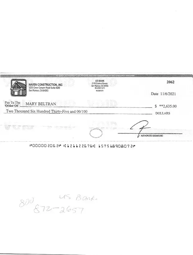 with a check that was bounced in a scam the check was from Haven Costructiion Inc. I called to inform them that was a scam and the company is a dummy company. and I did not get any satisfaction.