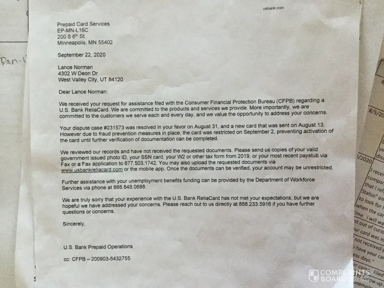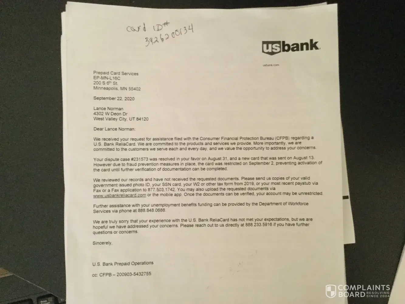 I haven't heard from you and still no resolution on above complaint. I have started believing that US Bank is as fraudulent and criminal as your Reliacard Dept. I am now blocked from even talking to Reliacard CS because they say I need a password, which THEY HAVE NEVER ASKED FOR BEFORE and I have never given them. For SEVEN MONTHS now, they have found every way in the book to prevent resolution of my case from not deactivating the card when I notified them it was stolen, saying they can't identify me, then saying they have to send request to management, then locking the account, and then hanging up on me numerous times when I have called...too many times for it to be an accident. There is no way to reach Reliacard except through the CS # and they are criminally negligent in their help. When I ask to be transferred to a supervisor or manager for escalated help, only after pleading do they "say" they will transfer me. They then put me on hold for three hours before the call is disconnected. Through a letter Prepaid Card Services in Minneapolis sent me on September 22, 2020, I was directed to either fax my DL, SS card and W-2 to 877.503.1742 to verify my identity, or upload it by signing into my account. I faxed the requested information but, obviously couldn't sign in and upload, because I need my 16-digit card number to sign in, WHICH I DO NOT HAVE. I faxed the information twice, and asked them to confirm through text or email that they received and could read the fax, but never got a response. And, only after finally talking with someone in CS did I get confirmation it was received and approved. But then they still didn't send a new card. The number in the letter said I could reach them at 888.233.5916, but that is the regular CS number and, again, they have been completely unresponsive. I was told to include in the fax the identifying Card ID#[protected] (don't even know if this is a legitimate number, but hope so). I am very surprised that a company of your stature would allow this type of service to occur. I have just recently filed a third complaint with the Consumer Finance Protection Bureau (second complaint # in the attached letter has never been resolved, even though they responded it had), BBB, and have sent a letter to my Congressman. It may behoove you to just send me a cashier's check to take care of this. I have tried to change information in my account, as I am no longer living at the address on file, but CS refuses to do this for me. Please issue a CASHIER'S CHECK to me (I do not trust that if I get a Reliacard it will work, and I don't trust that if you send me a regular check you won't stop payment), overnight to be by FedEx at 4598 Oxford Way, Bountiful, UT 84010. I have been trying for SEVEN MONTHS to resolve this issue, have no income because I have not found another job since COVID. I need MY unemployment money, you are keeping from me, all $12, 270.00, so I can survive the next few months. Again, please call me at [protected], email me at jwjerman@msn.com, or just overnight by FedEx the cashier's check. And, please retrain your Reliacard CS to treat people with a lot more respect. There are pages and pages of complaints on the internet about your service. Regards, Lance Norman
