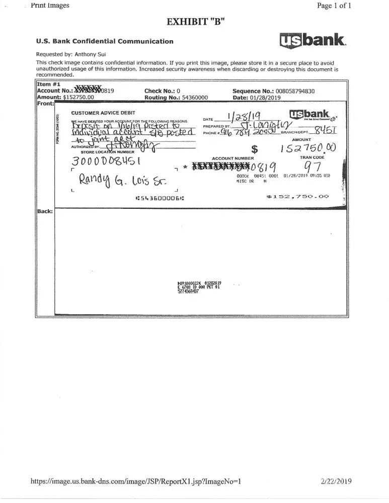 without my knowledge, permission, or signature, check was deposited into his personal account (exhibit "b"); as of this date I have not received one cent of this money. US bank at Roseville branch 8451. Should not have allowed randy to deposit this check into his personal account without my signature. Re-routing said check to our joint account without notifying me did not adequately protect my interest, because randy was able to deposit the entire amount into his personal account via phone transfer (see exhibit "b"). I wish to be issued a check for my 1/2 of above stated check amount, and will sign any indemnity agreement to assist you in prosecuting this matter.