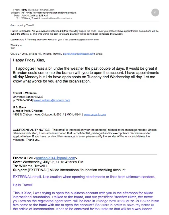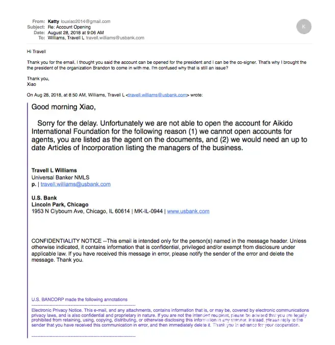 By the end of July, i worked with the banker Travell Williams at Lincoln park branch in Chicago to open a non-profit business checking account. After i provided documents, banker told method account can't be open for agent, but can be opened for the president of the organization, so i brought the president in. Travell assured me that he received everything he needed. Once the back office approves it, the account should be up and running. However, after 3 days, which is early august, i still didn't hear back from him.Starting from august 9th to august 27th, i called 5 times, left two voice messages, left messages to the bank teller, emailed the banker multiple times but received no response at all. On august 28th, the banker emailed me of the decision that the bank can't open the bank account due to the same issue- account can't be opened for agent. I emailed back asking why it is still an issue since i already brought the president of the organization to the bank in person but again, the email was ignored.