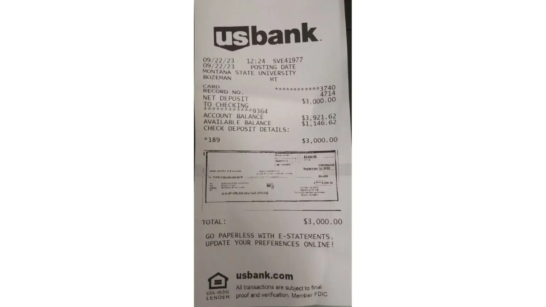 Dear Customer Service Team, I hope this message finds you well. I am writing to bring to your attention an issue I encountered with a recent deposit I made at one of your ATMs. On September 22, 2023, I deposited a check for USD 3,000 into the ATM located at Montana State University in the Strand Union building. The deposit was confirmed at the time, and I...