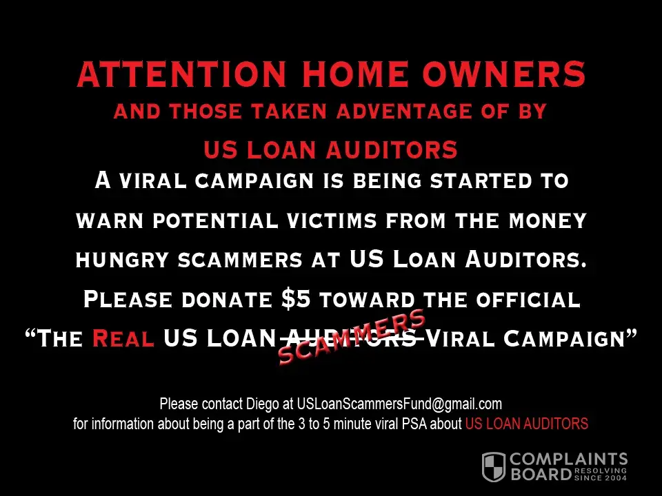 I'm looking for anyone that is willing to give us their story... recorded on video with audio, even if you want to remain anonymous... If you are passionate enough to want to tell the world your story of how US Loan Auditors scammed you... please contact us at usloanscammersfund@gmail.com