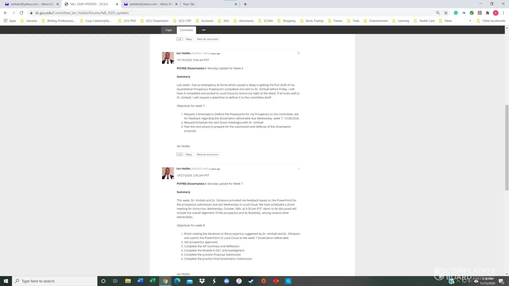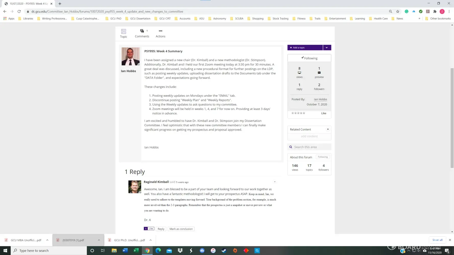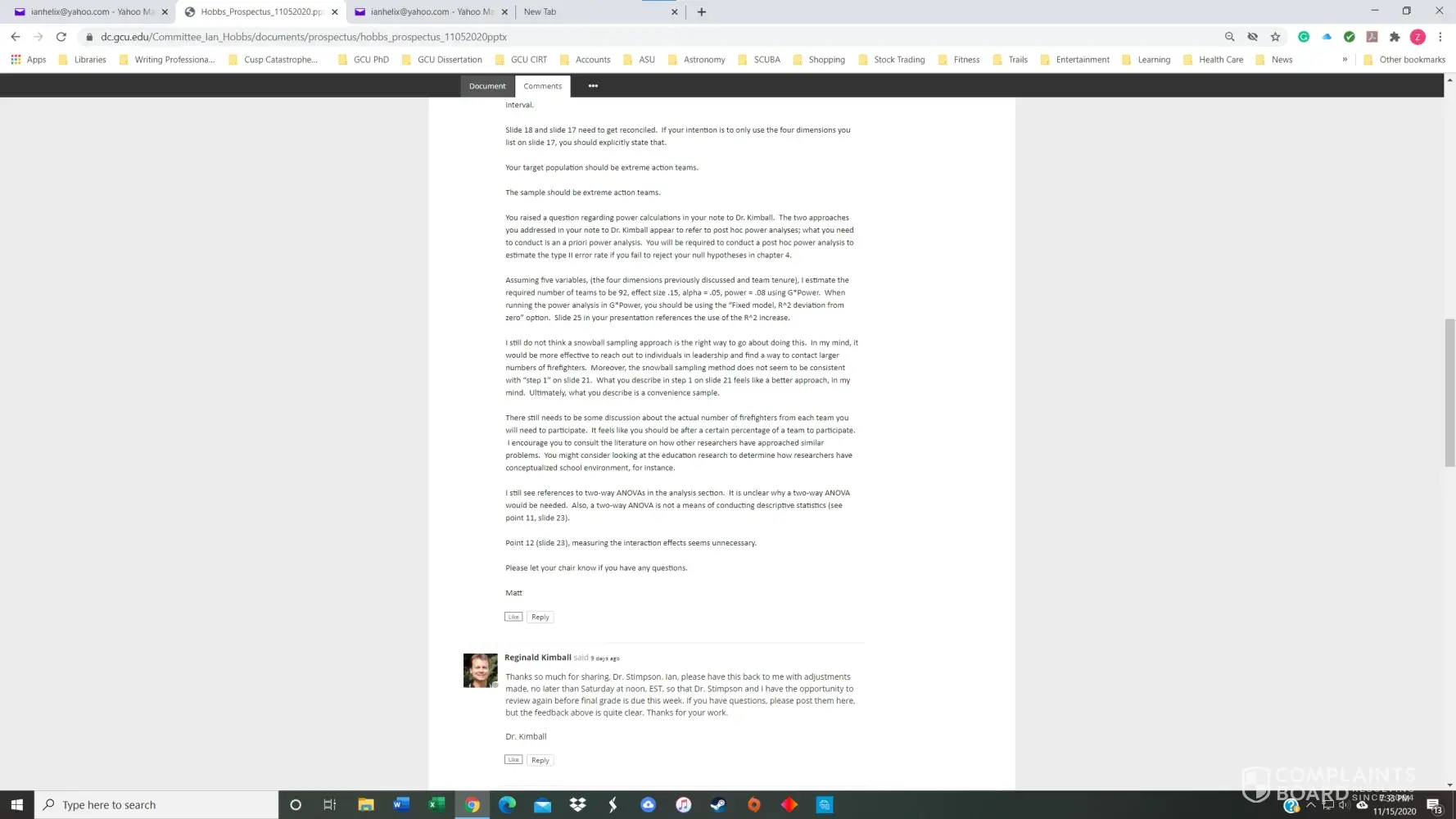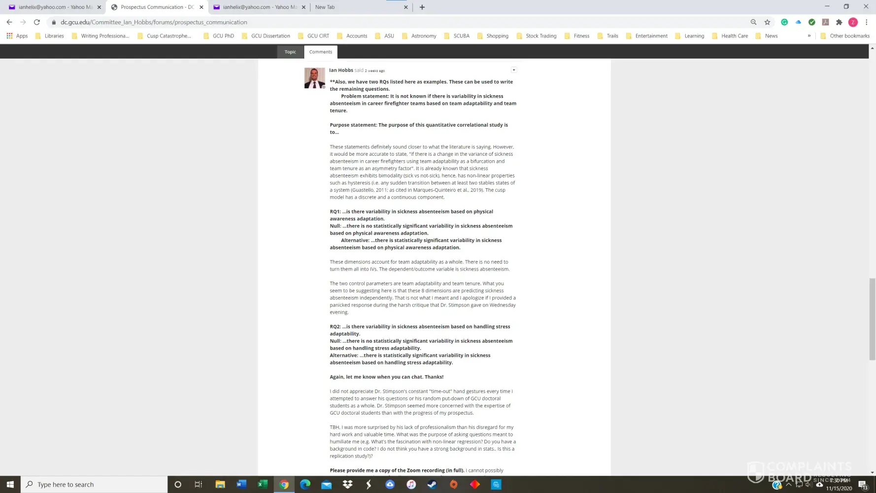 I had a 3.8 GPA in the GCU Doctoral Psychology program until November of 2020. I received my first chair, Dr. Maxson, for PSY855 Developing the Research Proposal, in early July. Dr. Maxson missed our first Zoom meeting because he was on vacation in Palm Springs, California, regardless that we had agreed to the meeting date/time only three days prior. He also stated on several occasions that he was not qualified to advise me on my dissertation topic and stonewalled many of my attempts to get substantive feedback. After making a complaint, he finally approved my prospectus but was replaced with Dr. Kimball and a new methodologist in week 4 of the next course, PSY955 Dissertation I.