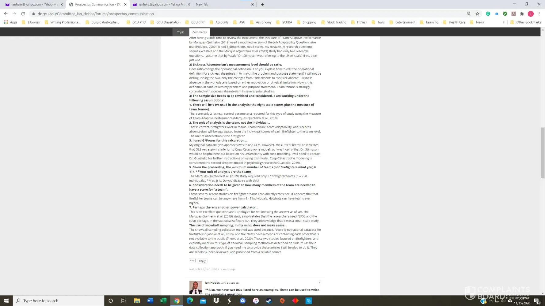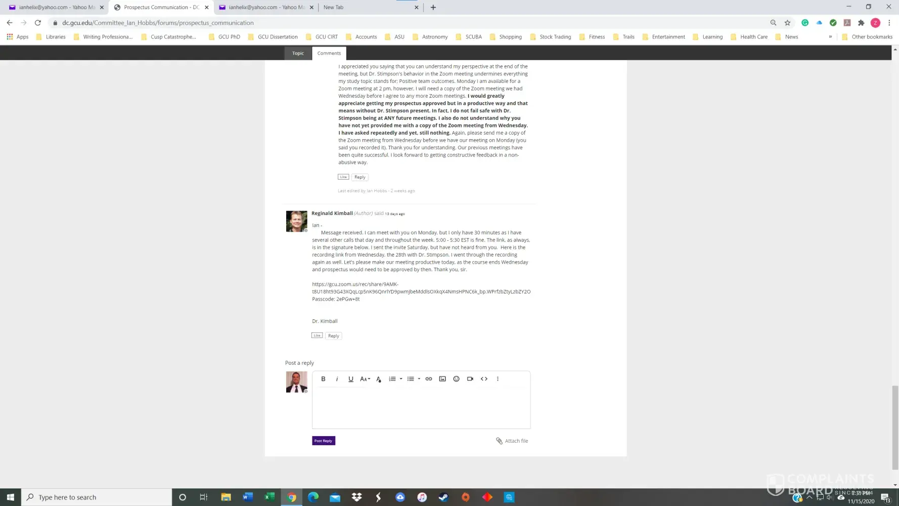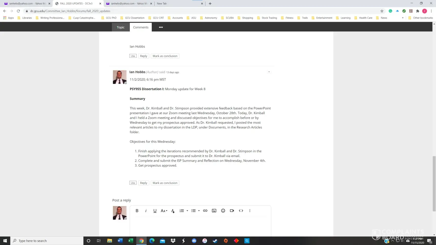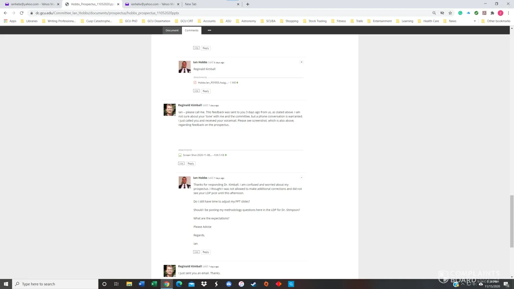I had a 3.8 GPA in the GCU Doctoral Psychology program until November of 2020. I received my first chair, Dr. Maxson, for PSY855 Developing the Research Proposal, in early July. Dr. Maxson missed our first Zoom meeting because he was on vacation in Palm Springs, California, regardless that we had agreed to the meeting date/time only three days prior. He also stated on several occasions that he was not qualified to advise me on my dissertation topic and stonewalled many of my attempts to get substantive feedback. After making a complaint, he finally approved my prospectus but was replaced with Dr. Kimball and a new methodologist in week 4 of the next course, PSY955 Dissertation I.