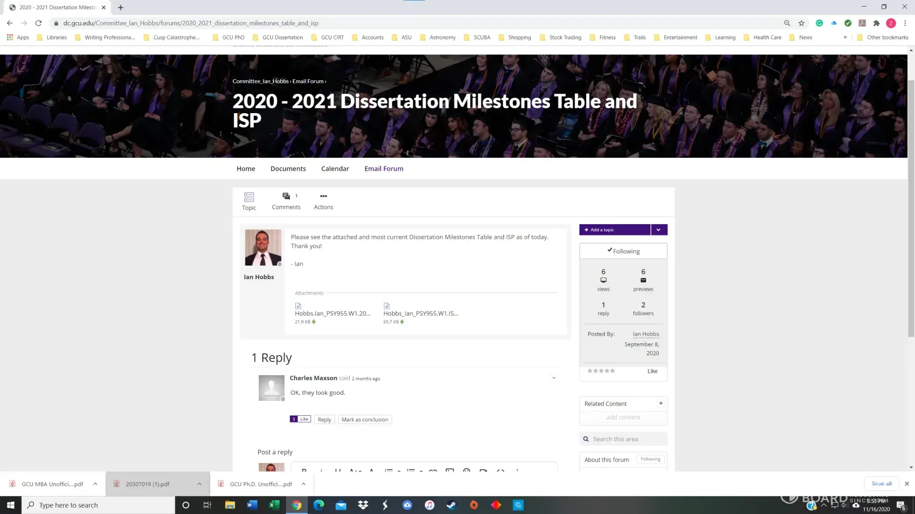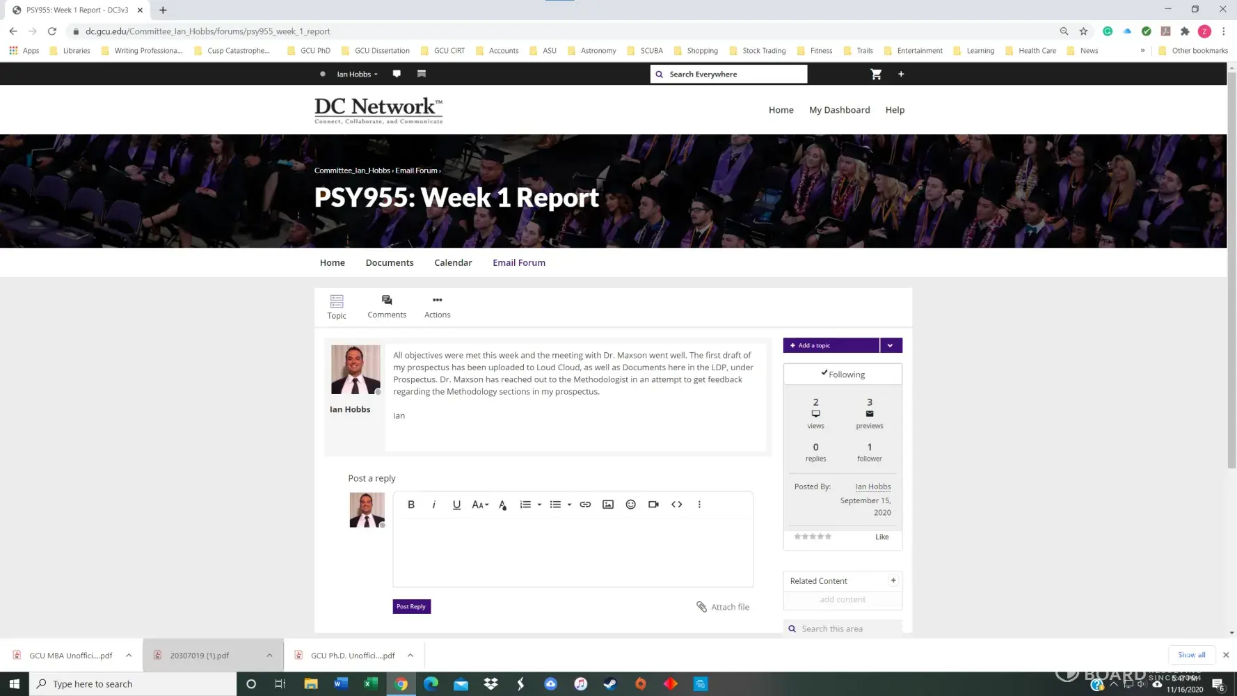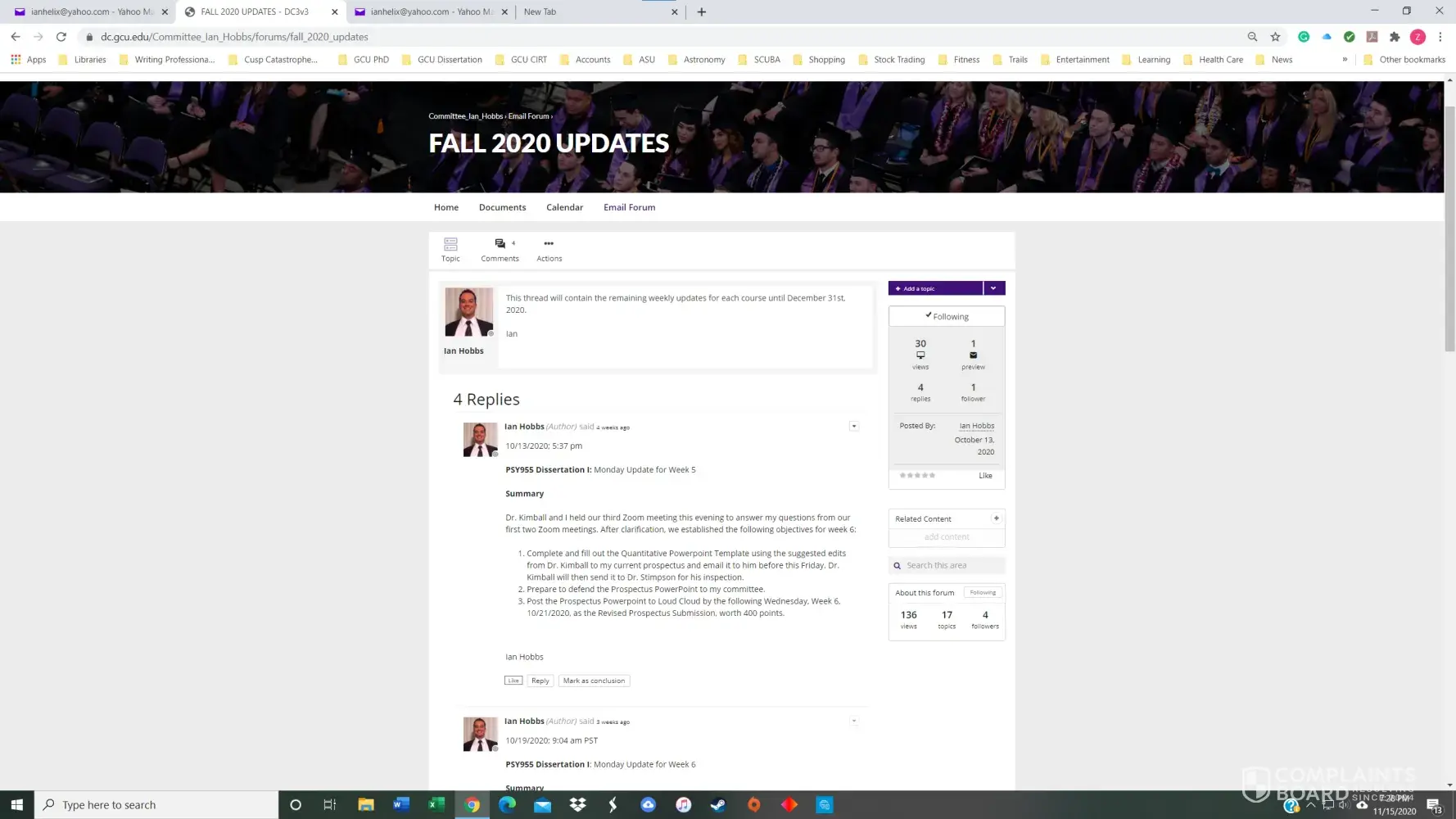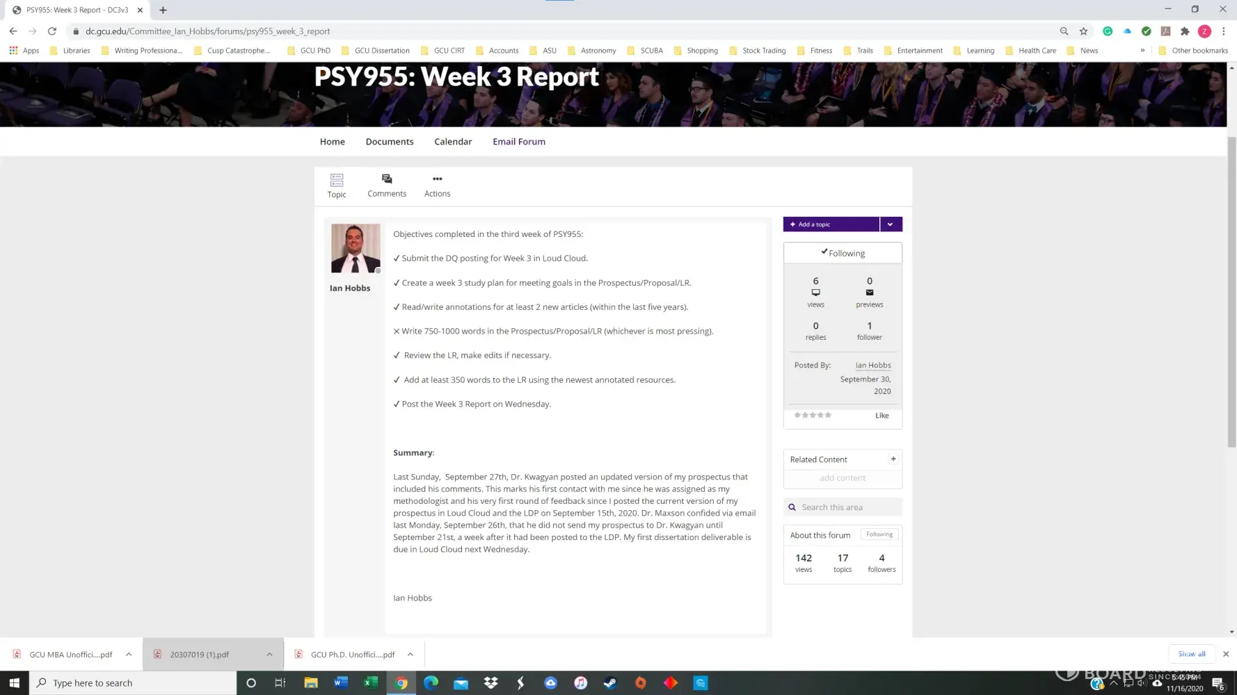 I had a 3.8 GPA in the GCU Doctoral Psychology program until November of 2020. I received my first chair, Dr. Maxson, for PSY855 Developing the Research Proposal, in early July. Dr. Maxson missed our first Zoom meeting because he was on vacation in Palm Springs, California, regardless that we had agreed to the meeting date/time only three days prior. He also stated on several occasions that he was not qualified to advise me on my dissertation topic and stonewalled many of my attempts to get substantive feedback. After making a complaint, he finally approved my prospectus but was replaced with Dr. Kimball and a new methodologist in week 4 of the next course, PSY955 Dissertation I.