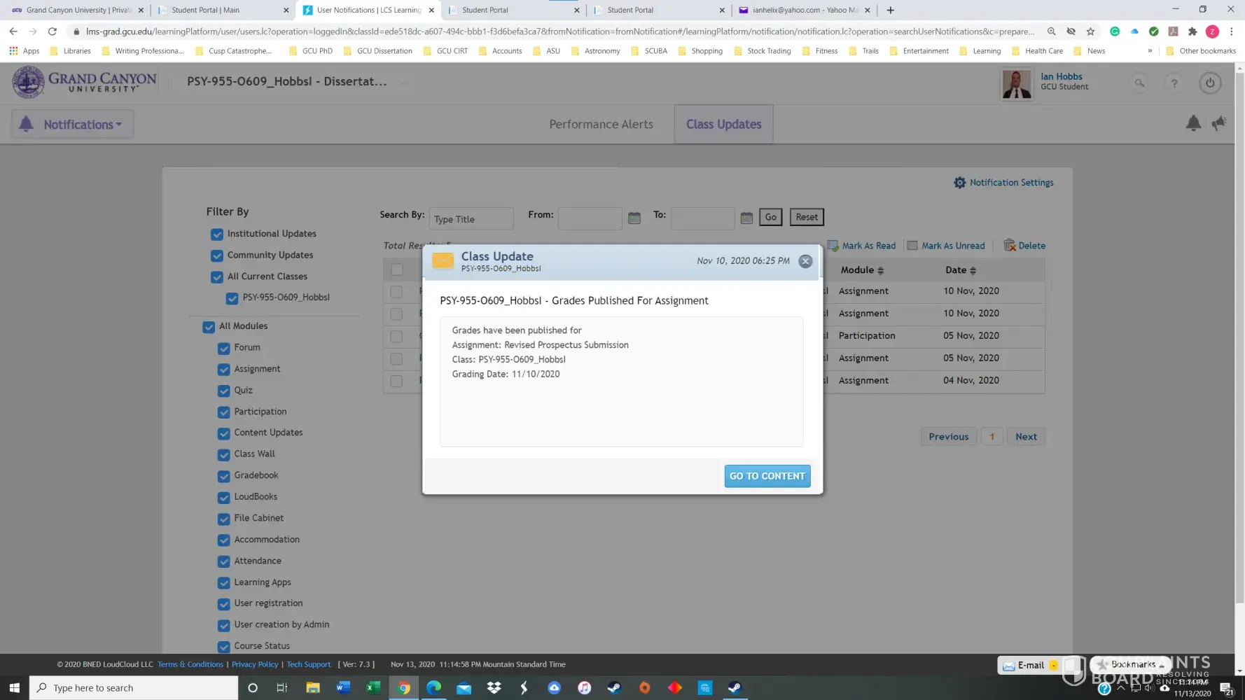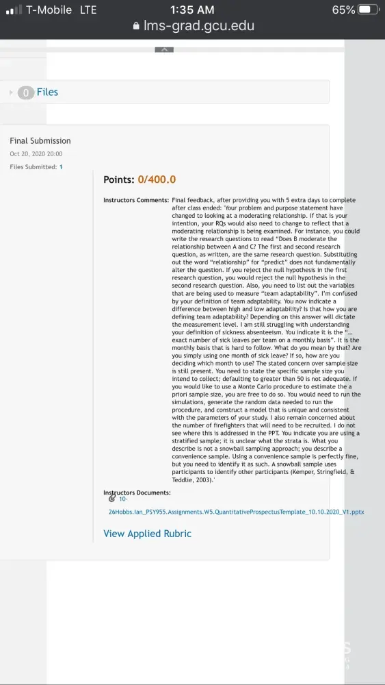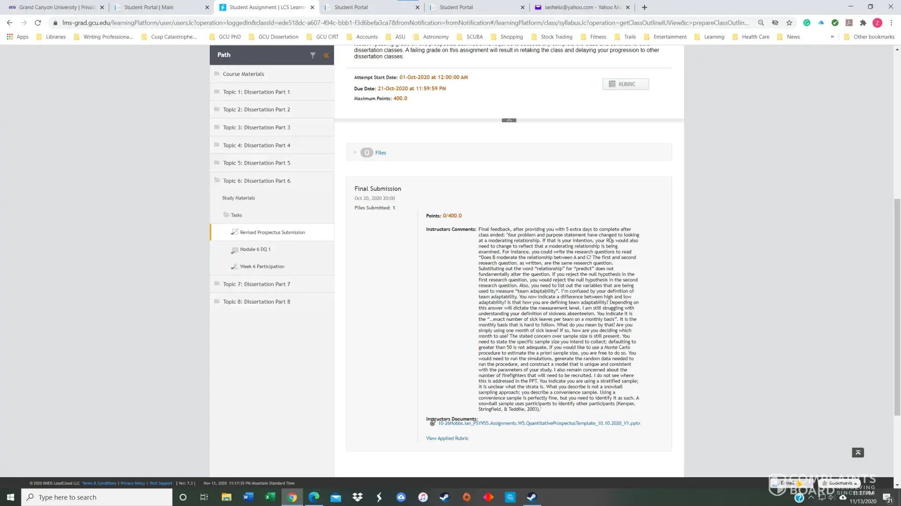 On Sunday evening, 11/8/2020, at 4:07 pm, Dr. Kimball finally informed me via email of the latest feedback that Dr. Stimpson and Dr. Kimball had provided in the LDP on Friday night 11/6/2020. I did my best and as quickly as possible to apply the requested revisions and submitted it in the LDP in response to Dr. Kimball in the LDP on Tuesday night 11/10/2020, because Loud Cloud would not allow me to submit anything after 11/2/2020. Nevertheless, Dr. Kimball graded it as a 0/400, the very next day, posting it several times in Loud Cloud in a row stating only, "This was posted 5 days late...", which it was not. Three days later my mother died on Friday night, 11/13/2020.