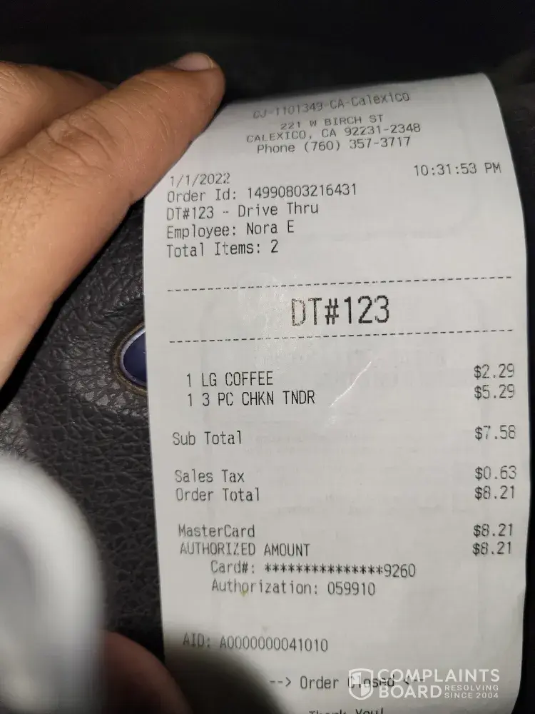 On 1/1/2022 I purchased a coffee and 3 piece chicken tender. When arrived to pay at the window only my coffee was given. I was asked to wait in the parking area for my order. Time I did not have due to being on duty. I strongly believe its unsat. That traffic is pushed along without a complete order. I had to leave drive thru paying $5.29 for an item I did not receive.