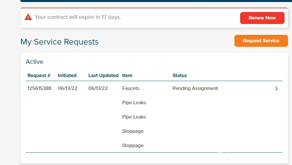 I submitted a request to AHS to fix a pipe and kitchen faucet leak on 4/25. I did not get a call back from the plumber after an initial message conversation on 4/25 where the plumber told me to chose a new faucet. I messaged the plumber on again on 4/27, 5/11 and 5/24 to confirm he would be coming to fix my issue. There was no response. On 5/31 I called AHS customer service to ask about getting a different plumber. I was told the field rep would contact the plumber then get back to me in 48 hours. There was no response. Then I received an email with a simple message saying this request cannot be processed. No follow up. I called AHS on 6/8 to find out what the progress was on my requests. The customer service agent was not aware of any of the previous agent's work and we started from the beginning again. They said they would have to verify with their 'escalation' agents that the plumber was not available. I would receive a call back with in 48 hours. No response was received after waiting a week. I did receive calls to renew my contract but no call to fix my outstanding requests. I called AHS on 6/13 to check on progress. they had no new information or notations from my previous calls.