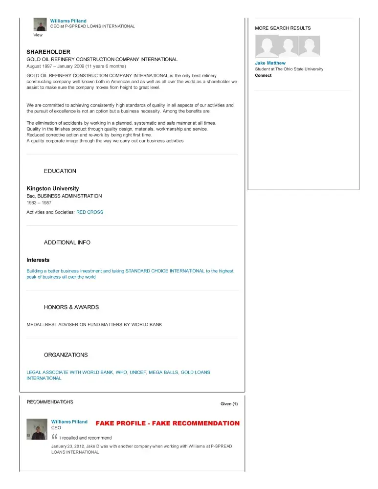 Below is a link to people that have been scammed by these crooks who are using linkedin. Hopefully someone at linkedin, facebook and other social networks can help streamline the reporting process, and help stop good people from getting scammed.