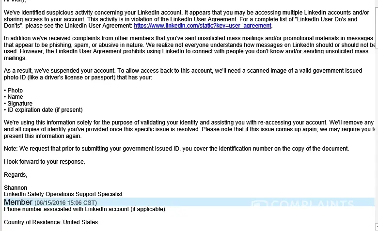 "Shannon" with no last name wants our entire families: Drivers License, "SIGNATURE", PHOTO, FULL ADDRESS & DATE OF BIRTH. Sent to "Shannon" who we don't know where our information is going. I found you can file a SMALL CLAIMS COURT ACTION in your own state. Because Linkedin operates over 70% of their business out of their own area. You don't have to file a SMALL CLAIMS COURT ACTION in their courts area.