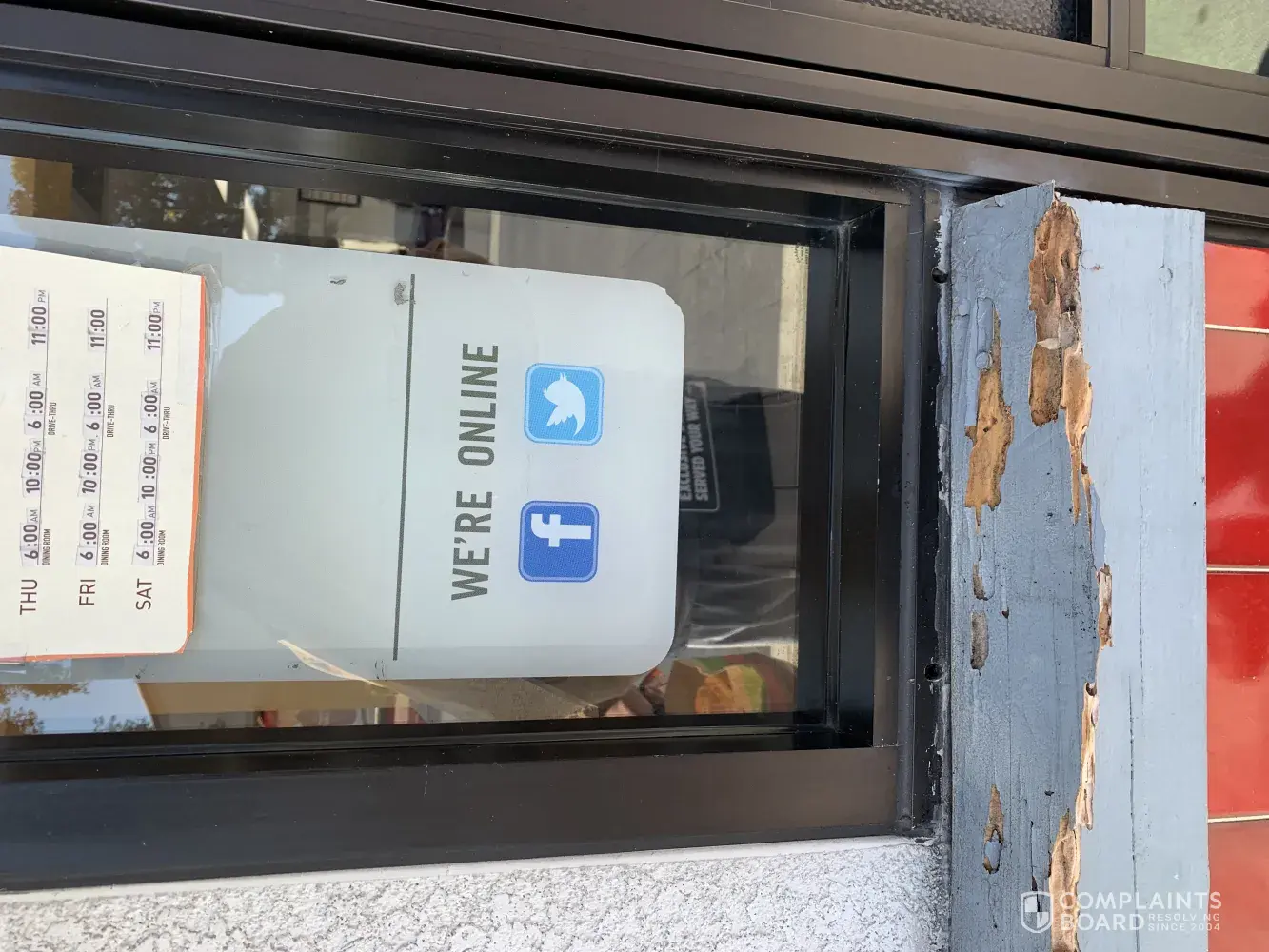 This restaurant has had very visible termite damage for over 3 years. I have sent a letter to Customer Relations Dept. asking when this can be repaired. It is very disturbing to look at and in my opinion reflects poorly on the Burger King company. I've included photos that honestly don't really show the full extent of the outer appearance the place