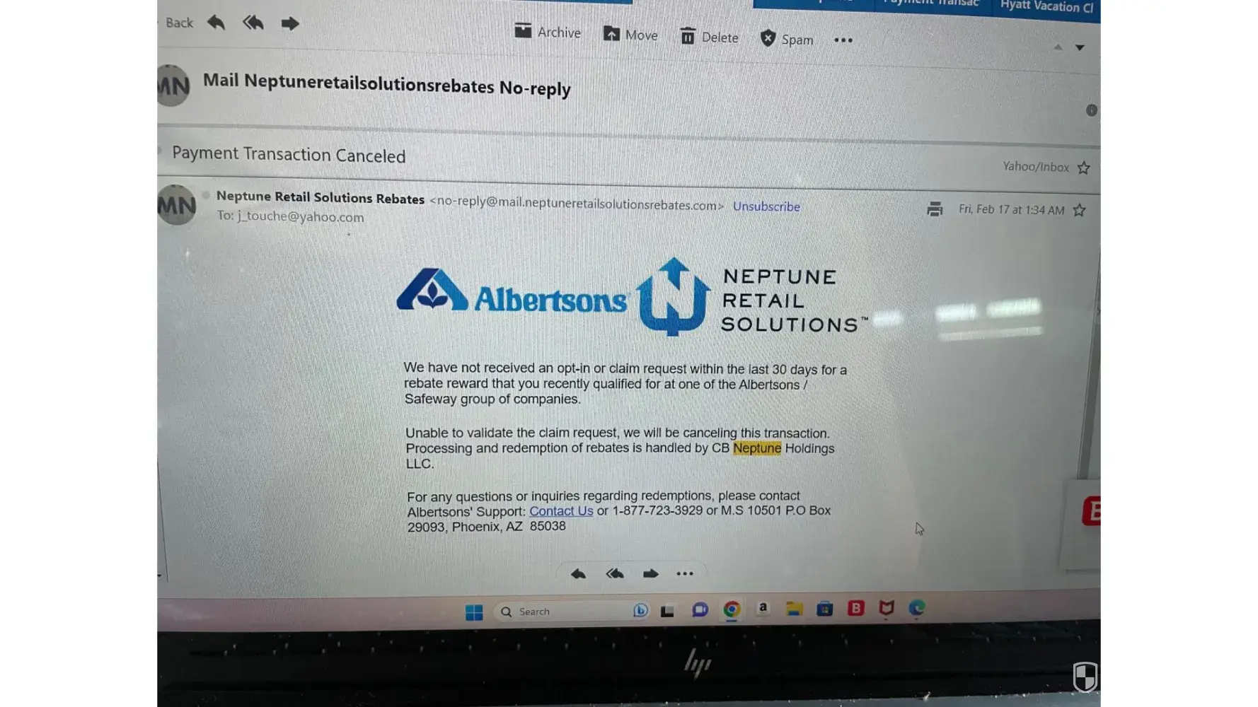 Unable to validate the claim request, we will be canceling this transaction. Processing and redemption of rebates is handled by CB Neptune Holdings LLC.