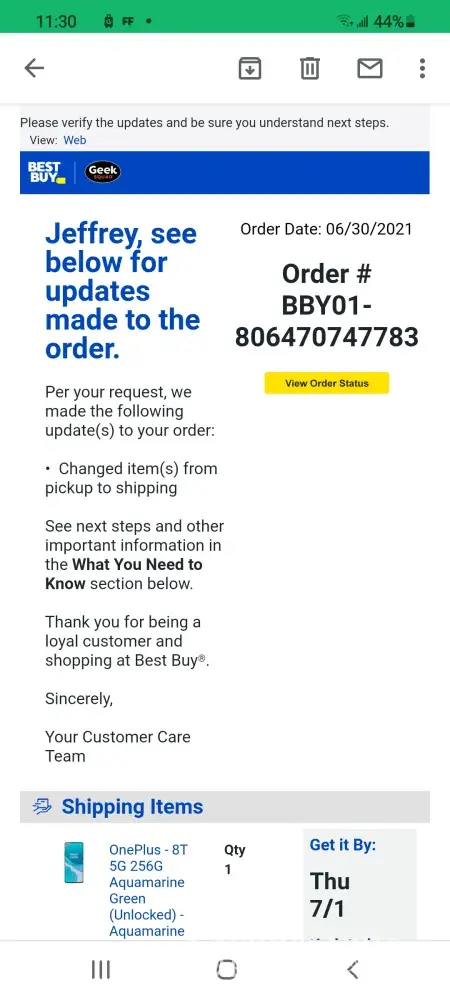 Best buy San Francisco, ordered a OnePlus 8t for $580 online that said it would be available for pickup today, suddenly I got an email saying "at my request the status of the order has been changed" and now the phone is being delivered to an address I don't live at anymore, and I can't make changes to the order from the website when I called to talk to someone about it, I was put on hold for 10 minutes and then I was hung up on and when I called. Back got a message that they aren't accepting calls at this. Time... So what happens to. My $580?