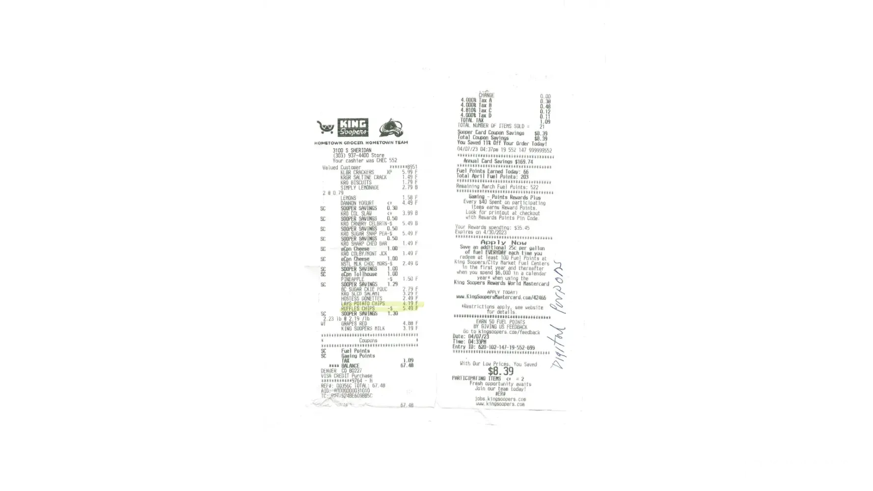 I've been shopping with King Soopers (Bear Valley) for 30+ years now and now that I'm in the elderly crowd, I find your Digital Coupons and store specials to be frustrating; especially for the elderly. Many of us do not have IPhones and therefore cannot pull up the coupons. I have asked for assistance on numerous occasions and only been treated like I was bothering the clerk. Additionally, your specials like buy 5 bags of chips and get them for 1.99 each is crazy; I am a senior and only eat 1 or 2 bags of chips a month. Therefore, I have to pay the $5.99 each. This seems so unfair. Why can I not get the same price as everyone else? Last purchase was on 4/7/23 at 4:33 PM. ID# [protected]-699.