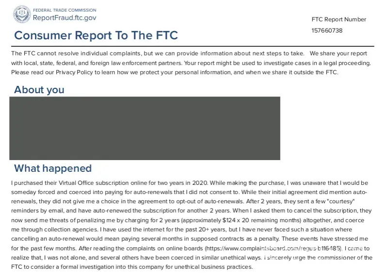 I have filed my report to FTC. Hope everyone coerced with auto-renewals by this fraud company will do that same. Here's how I did: Opened reportfraud.ftc.gov and selected "Online shopping"; On next page -> "A problem with an online purchase.." -> "I was not given opportunity to consent to delay or get a refund" -> "Credit card" -> "I had difficulty cancelling a recurring charge" -> for company "Regus Management Group LLC". Fingers crossed! \,/