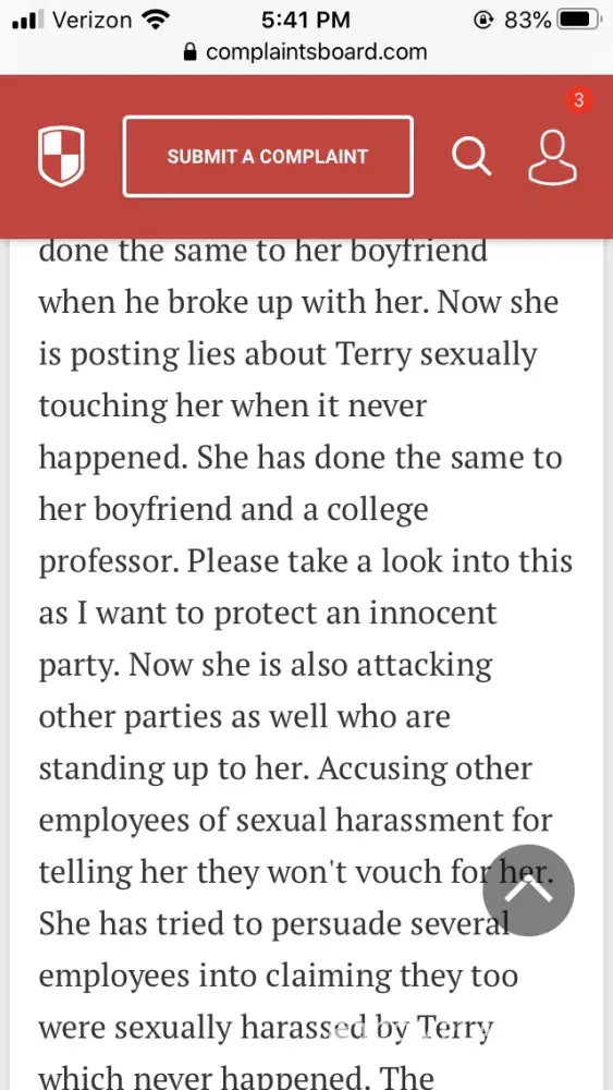 The only one making fake accounts is you which is ms Terry and ms Terry fired me to try to cover up her sexually harassing me and @Ratery is Terry and your not a dude your ms Terry making yet another fake account weather you make yourself a girl or boy it’s a fake account ms Terry has made to try to cover up what she did to me and ain’t nobody spreading lies the cameras seen it All and ms Terry did sexually harass me if it is anyone ms Terry should be sent down and slapped in the face I did not lie about anything ms Terry DID TOUCH ME the cameras will show and we are still suing ms Terry yea I was fired for 4 write ups that I never signed or even seen and ms Terry has been putting her arm around me and touching me way before she fired me this has nothing to do with Grammar you dummy this has to do with ms Terry sexually harassing me and the cameras seen it my mom raised me perfectly don’t talk about my mom and I did not lie about anything I said ms Terry DID TOUCH Me SHE DID SHE DID SHE DID She DID SHE DID SHE DID SHE DID TOUCH ME AND I AM NEVER CHANGING MY STORY EVER EVER EVER AND IF YOUR NOT TERRY then why do you keep saying “ I am not Terry” you dummy And ain’t nobody spreading lies ms Terry DID SEXUALLY HARASS ME AND SHE IS THE ONLY ONE I AM ACCUSING OF SEXUALLY HARASSING ME AND I AM ALREADY TAKING MS TERRY TO COURT THE ONLY ONE THATS GONNA BE SUED IS MS TERRY NOTHING I SAID WAS FALSE MS TERRY DID TOUCH ME SHE DID SHE DID @ratery is ms Terry and ms Terry did SEXUALLY HARASS ME and I am never ever ever ever ever changing my story and I AM GROWN UP ms Terry is a creepy old [censored] lady she is sooooo sick in the head and A veryyyy disgusting woman 🤮🤮🤢🤢I am not falsely accusing anyone ms Terry DID TOUCH ME she DID SEXUALLY HARASS ME SHE DID SHE DID SHE DID MS TERRY TOUCHED ME SHE DID AND MS TERRY ALREADY HAD A COMPLAINT BOARD ACCOUNT BEFORE I HAD MINES AND SHE IS TRYING SO HARD TO COVER UP HER SEXUALLY HARASSING ME AND TOUCHING ME AND AINT NOBODY SPREADING LIES I DID NOT TELL ANY LIES ABOUT MS TERRY SHE DID SEXUALLY HARASS ME SHE DID SEXUALLY VIOLATE ME SHE DID TOUCH ME SHE DID SHE DID SHE DID SHE DID AND And must I emphasize I am neverrrrrr going to change my story and I was going to get a new job anyway just to avoid ms Terry she made me feel sooooooo uncomfortable and violated and the way I type has nothing to do with ms Terry sexually harassing me and ms Terry DID MAKE FAKE complaints board accounts pretending to be me and she wrote a false statement and False comments I never changed my story ms TERRY DID SEXUALLY HARASS ME and I am never changing my story SHE DID TOUCH ME SHE DID SHE IS SOOO SICK IN THE HEAD AND SOOO NASTY AND GROSS 🤮🤢🤮🤢🤮🤢 I am taking ms Terry to court already you dummy so be ready cause and sueing her I never lied about ms terry touching me and sexually harassing me SHE DID TOUCH ME SHE DID and the only one that is making fake accounts is ms Terry weather they are male or female you dummy and you are ms Terry stop lying I’m sueing ms Terry for sexually harassing me and touching me regardless of what she says and god knows she is Dead [censored] wrong so I’m going to just give it to God and pray about it