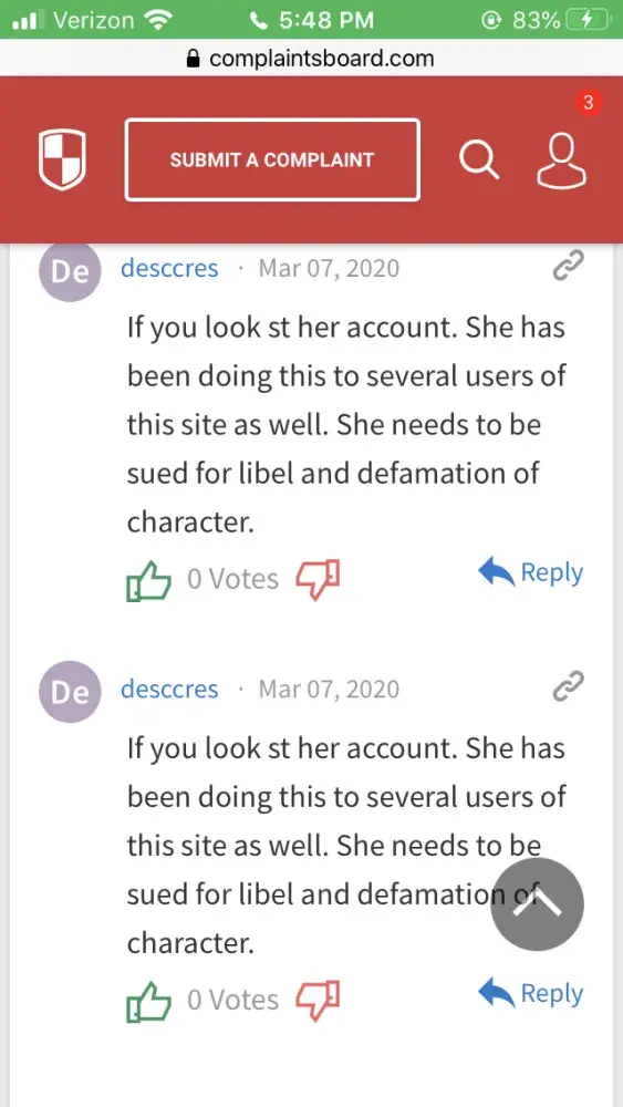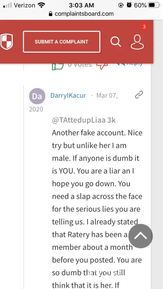 March 6 you ms terry posted that comment and that is not my account that is a fake complaint board account ms Terry has made pretending to be me and I have proof of everything today is March 9 ms Terry you know you are wrong and god knows it to so I’m off this [censored] the cameras will show