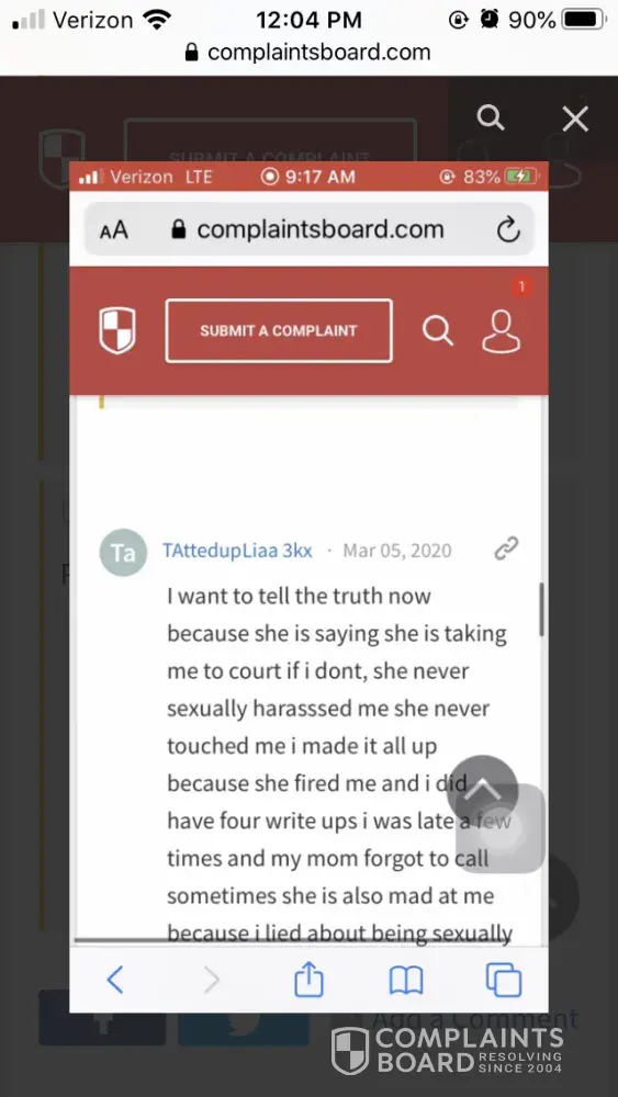 This is mahlia again she has changed her complaint board account name to @readet but it was originally @Ratery she thinks she is going to get away with writing a false statement by making a fake account that has the same name as my original complaint board account which is TAttedupLiaa3k but the difference is mine has a picture above and 4 multiple complaints and I am adding more and telling you more details about how she was sexually violating while I was working there she use to always try to touch me and rub on me she always use to put her arm around my neck and you can look at the cameras there is proof and now she has made a fake account that has the same name as my complaint board account they are both spelled the same but the difference is my true complaint board account has a picture above and 4 plus complaints she originally had a x at the the end of the fake account and I have proof there is a picture below and the statement that she wrote and I did not write that statement she did me terry she is trying to cover up her sexually harassing me and violating me and she has just now changed her name on complaint board to @readet but originally was @Ratery and I have proof of that also there will be screen shots below