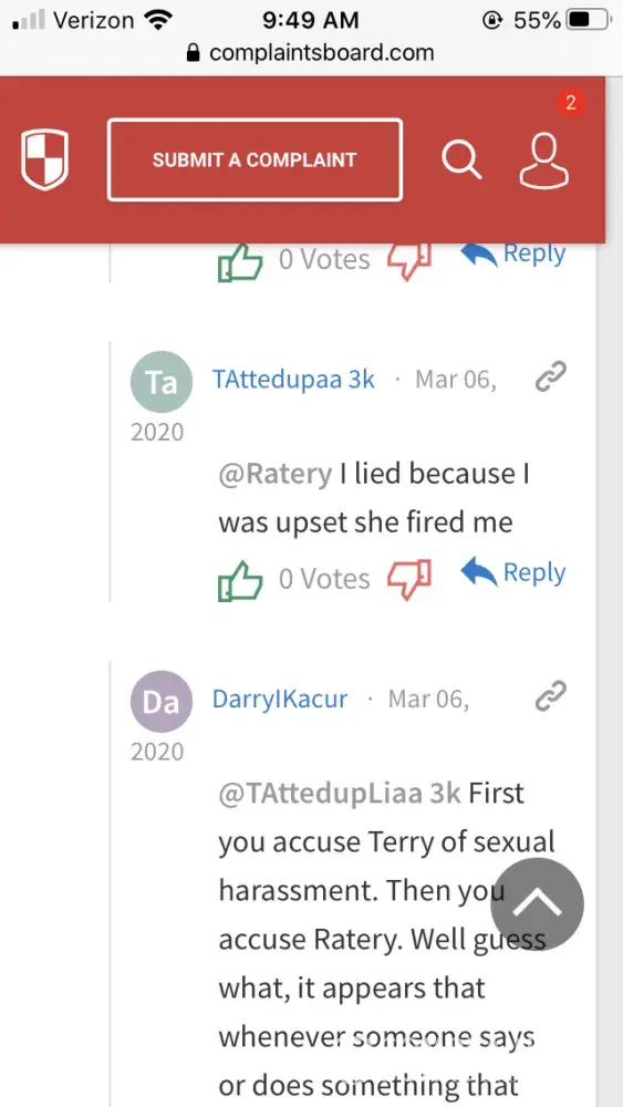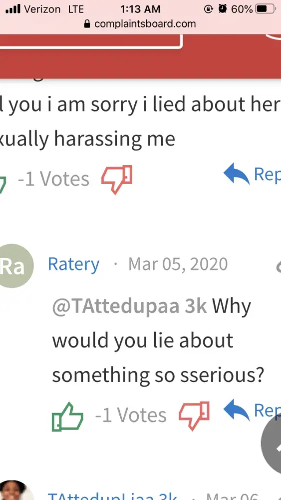 This is I mahlia rejae Sampson everything I said in my first original statement was true the fake account ms terry made which was TAttedupLiaa 3kx was not me she now has changed it to tattedupaa3k and keeps changing the name and I had an original statement I wrote on an account that I lost my password to it says at the bottom of that statement that I mahlia rejae Sampson did write that statement and now she is using that account name that I lost the password to which is mahlia Sampson to try to pretend to be me and say and deny that she didn't touch me when I already said that she DID touch me multiple times and that I was never ever ever ever ever going to change my story the picture below the first one is the account I lost my password to and had already made a statement on it and it says 0 comments and 1 compliant now ms Terry has used that name to pretend to be me you will see down below you can click on where she put @readet and see that That is a fake account she made using my name mahlia Sampson the name of the account that I lost my password to and had originally made one statement on And had zero comments on the fake account The fake account she made does not have that written statement on the profile it only has 9 comments she commented saying I made it all up and I did not make anything thing up She did sexually harass me you will see that there are two mahlia Sampsons and the account I lost the password to only had a statement I written with no comments you will see the difference and seek out the fake account the third photo is the fake account ms Terry made and following that third photo the 4th one behind it is the other fake Account she made Which was originally TAttedupLiaa3kx but she changed it to tattedupaa3k and keeps changing it to try to cover herself up the fifth photo is the false statement that ms Terry wrote and she made with the fake account which is photo 4 that I Mahlia Sampson did not write and now she has made another fake account named @Darrylkacur pretending to be a guy this time and you will see she keeps saying @ ratery is not Terry when it is ms Terry and you will see it says " @ratery I told her off"so tell me why would she say @ ratery if she kept saying it wasn't ms Terry and you can also see on one of the photos she comments as @Ratery and says " why would you lie about something so serious " she also has another account named @Readet you will see below all of it is posted the next 9 photos are just proof she has made multiple accounts and is trying to cover herself up and deny her sexually harassing me the absolute last photo is my TRUE complaint board account TAttedupLiaa3k WITH THE PICTURE ABOVE that has 4 plus complaints and 20 comments please look into this please she is trying so hard to cover up and deny her sexually harassing me and I MAHLIA REJAE SAMPSON AM NOT CHANGING MY STORY EVERRRR