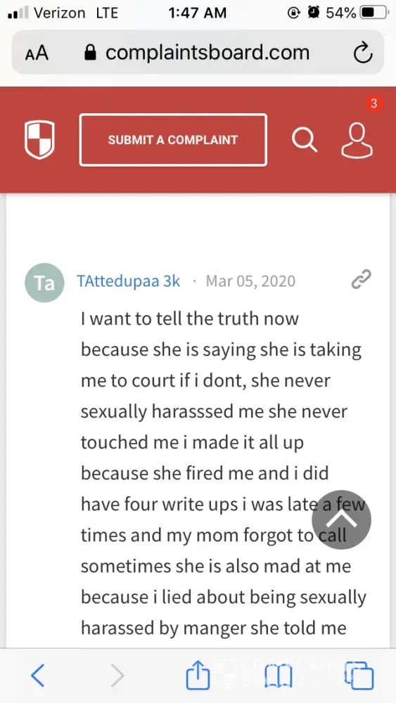 Bruh this is insane me terry keeps using the fake complaint board accounts pretending to be me againnnn I'm am so done with this [censored] the statement below in the picture I did not write ms Terry DID she has a fake complaint board account pretending to be me she keeps changing the name first it was 3kx then TAttedupaa 3k now she has changed it to TAttedupLiaa3k with a different font I'm so damn tired of this and she ms Terry did SEXUALLY HARASS ME SHE DID SHE SHE DID SHE DID and I never lied about anything she did touch me AND please check the cameras bye I'm giving this to god