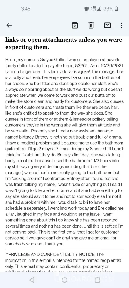 Recently I quit my job at family Dollar. I enjoyed my time working there however I will not tolerate being bullied because of my medical issues (severe hearing loss & a very weak bladder). I quit because the main manager is a bully, she called me names, laughed in my face, talked badly about me as if I wasn't there, mocked me & refused to let me use the restroom (I would be working 8 hour shifts) she treats her staff and customers as if she is above them & we are just ants who can be walked over. She's Been reported by several customers and employees but nothing has happened. I will not stop until she has been fired. She yells at her customers & cusses them out because they call her out for being a [censored]ty boss.