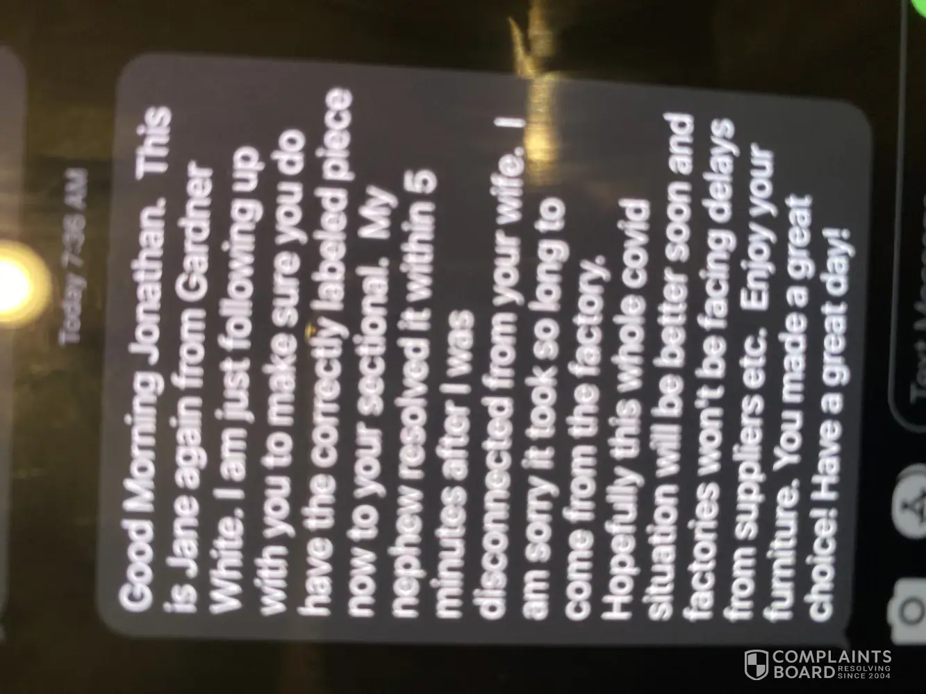 My husband and I ordered a couch mid October for a new home and were told by Jane and the Gardner white location if macomb mi off of Hayes road. She assured and reassured us at the time it would be here no later than late November. 4 months later, we received the couch-with the cuddler on the wrong side. I reached out to Gardner white and spoke with Jenny I believe in customer service, she was very helpful, she reached out to Jane who contacted my husbands cell because it was her day off. When I spoke to her about my issues she was extremely rude, cut me off saying "I'm going to stop you right there." I have worked in customer service my whole life and am now in fine dining. If an employee of mine ever made any guests' experience this awful I would want to know. Only the phone she tried to blame Covid, which I understand fully there is a pandemic. But COVID was prominent when we ordered the couch mid October, and she failed to mention any delay because she was being manipulative to a young couple and wanted a commission check no matter OUR inconvenience. My 11 month old and 4 year old had no couch for four months. On top of that, My frustration was that we were one, never told about any type of possible delay and two, it came four months late and was wrong, so I was understandably frustrated. Jane made everything so much worse. She didn't reach back out to us concerning anything throughout the process when we contacted her, but chose to call and be very out of line and rude via her personal phone number on her day off. I made it clear on the phone I didn't want to work with her anymore and told her that I would be calling Gardner white to make sure they were aware, she said "that's fine." I did so, again speaking to Jenny who was great and then the supervisor who said she would make janes supervisor aware. Not only did Jane text again last night, after being made aware we no longer wanted to work with her, being very passive aggressive, she also texted my husband again this morning before 8 a.m. which is illegal in Michigan. Again being passive aggressive. This experience has been absolutely horrendous and Jane definitely needs some type of repercussion because I'm sure we are not the only people she has treated so unprofessionally.
