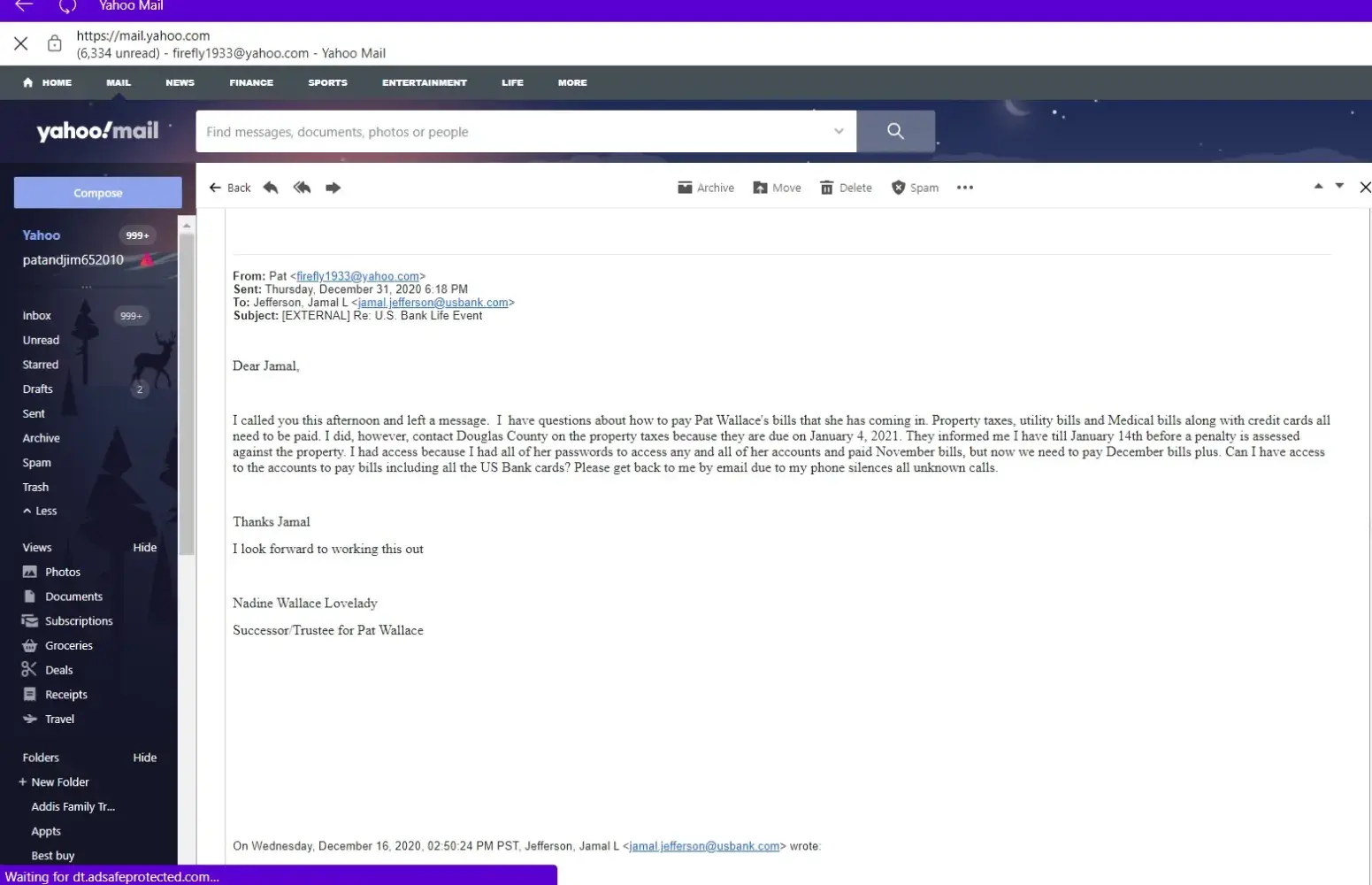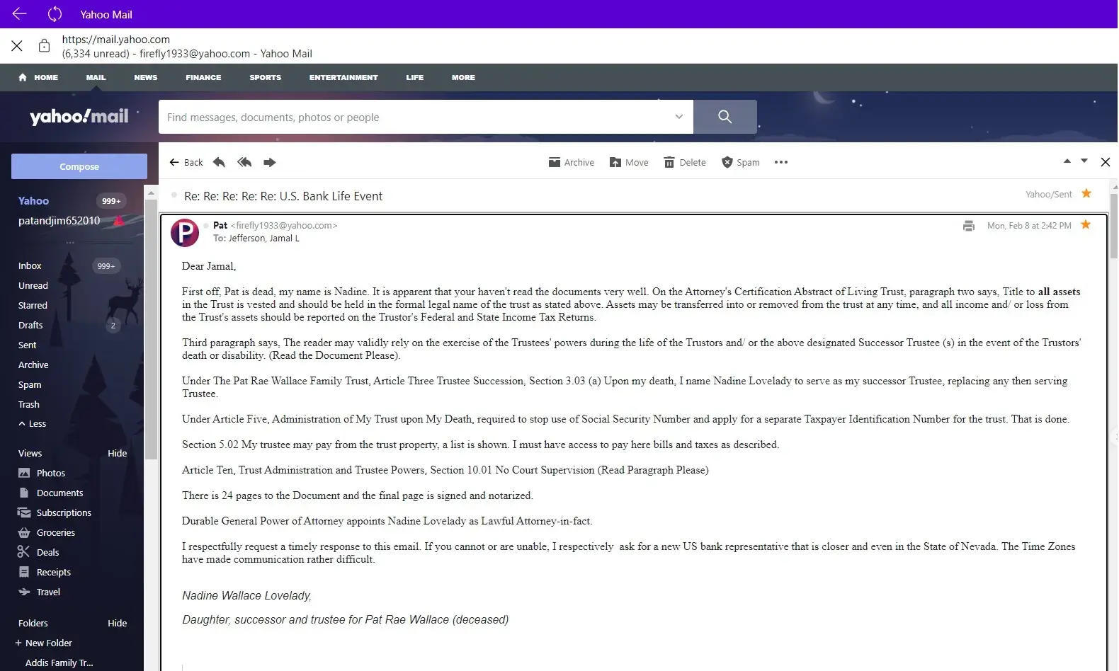 The stress he has put on me is tremendous, holding my deceased mothers money from me, late fees piling up, bills way over due, and screwing her credit up. The trust lawyer and another local attorney have looked over the trust and says everything is legal and there should be no questions, here in Nevada. He keeps going over it with who knows what state laws and keeps denying me. I have 1 email that we keep replying on since December 16, 2020. He is horrible.