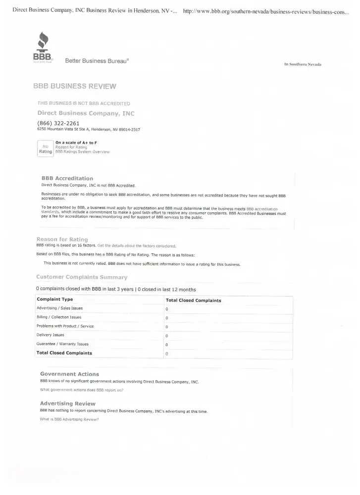 Why do all their previous companies have F ratings and why do they have alerts? Oh because they are fraud companies. Direct Busines just opened they have no rating but we know that is just their NEW name. BEWARE, the BBB rating has not had time to go down, they just changed their name and as time goes by the rating will go down.