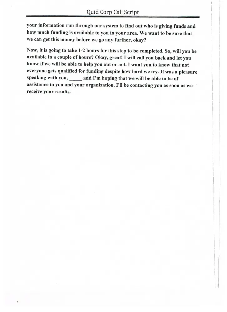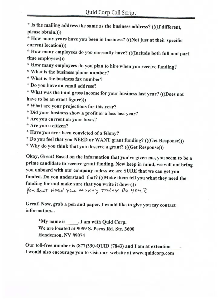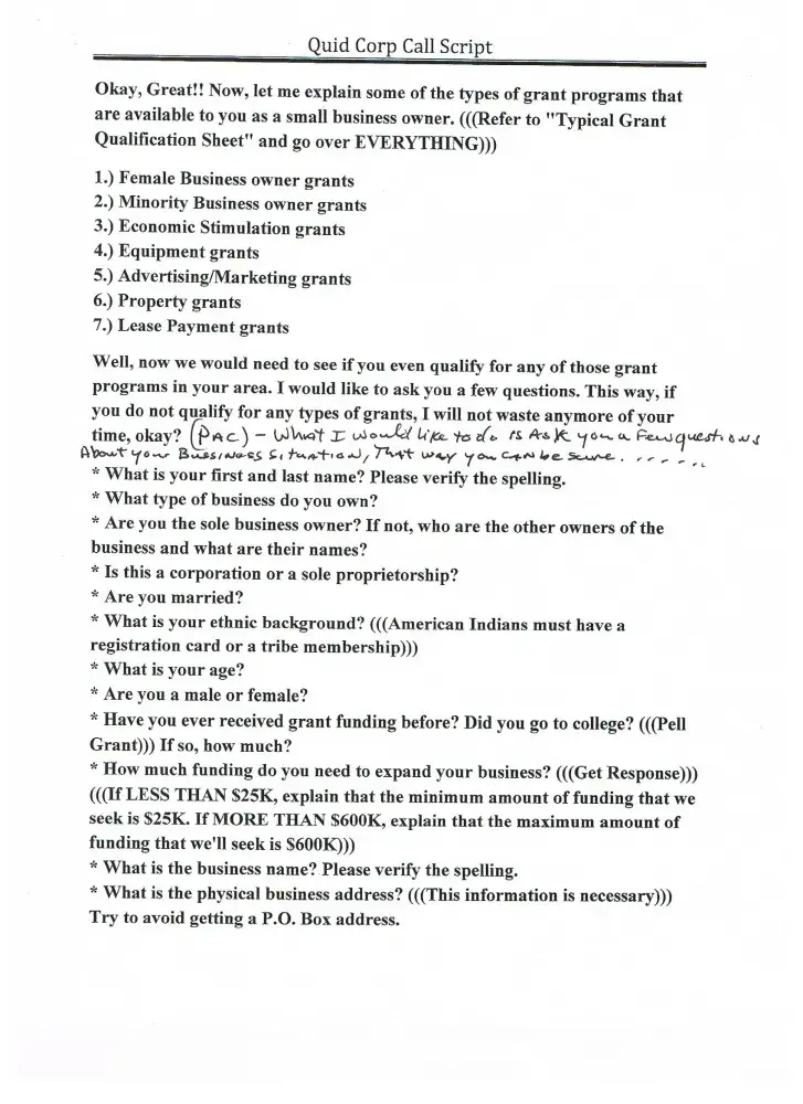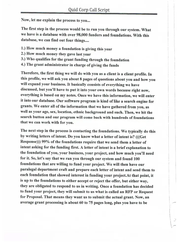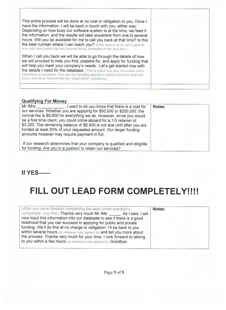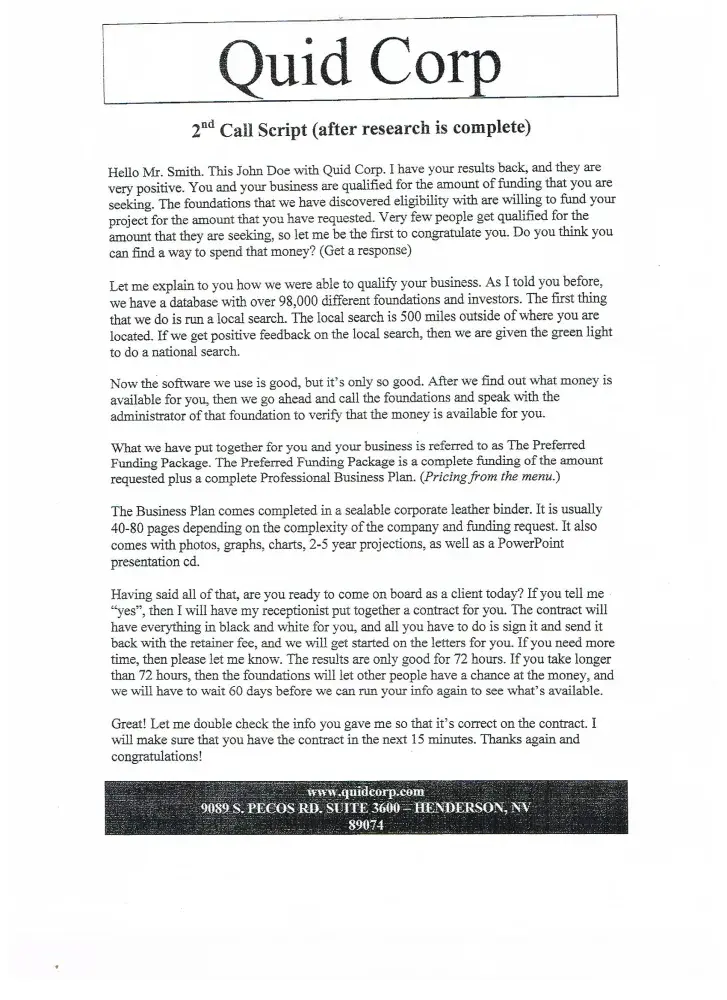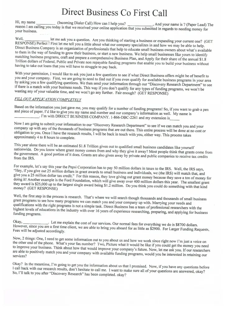 The call you over the phone and tell you if you pay them a fee and buy a business plan then they will help you get hundred and thousands of dollars in grant money. It is a lie. Ask the FBI they have not ever helped one company get a penny of funding.