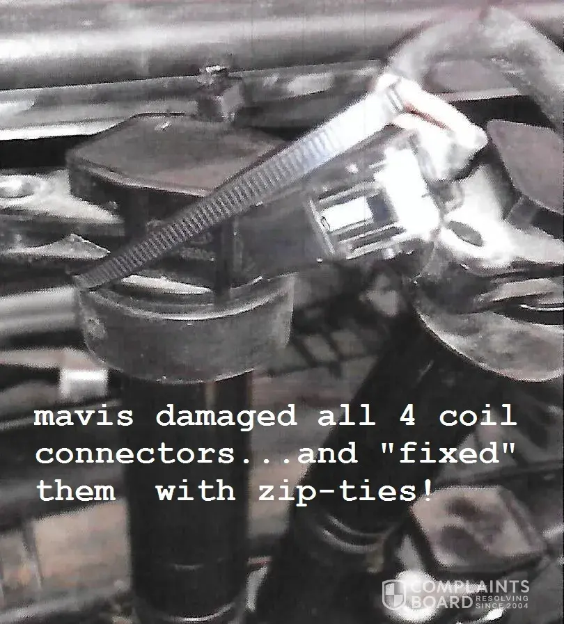 7. Hyundai installs 4 proper plugs and informs me that the coils on the car are the old, original OEM coils and that one of them is bad. That explains why Mavis could not hand me my old coils. They were on the car. I was charged for 4 incorrect plugs and 4 new coils which I do not have in my possession. I have it in handwriting that the reason my 4 coils were zip tied together by Mavis is because they damaged the 2500.00 wiring harness while they were playing musical chairs with all the coils.
