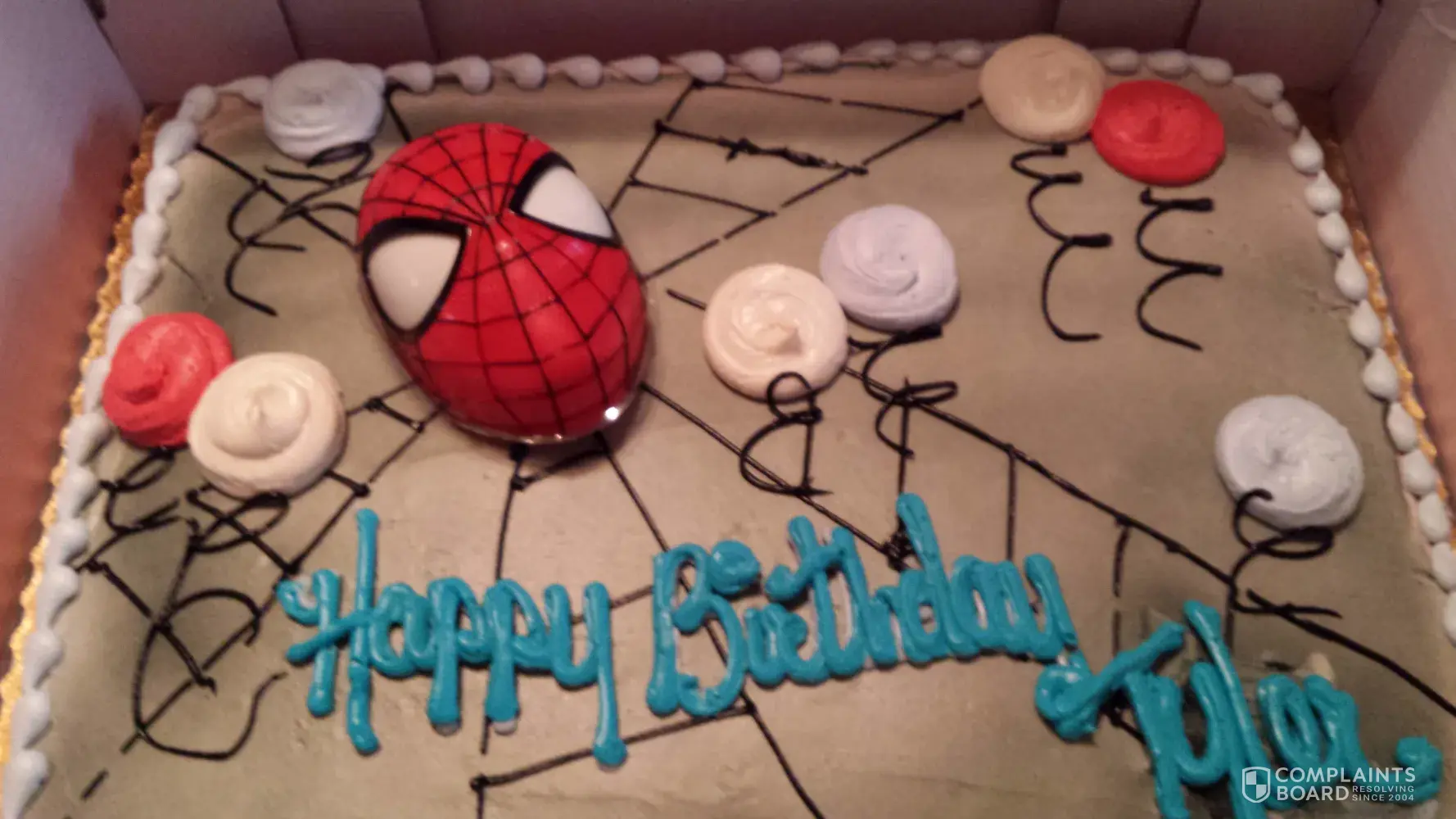 Ordered spider cake for Tyler red and blue..got a silver and black that said nick..very pissed off they had 2 weeks to make the cake..could have called and said they didn't have the colors that was needed to do the cake...