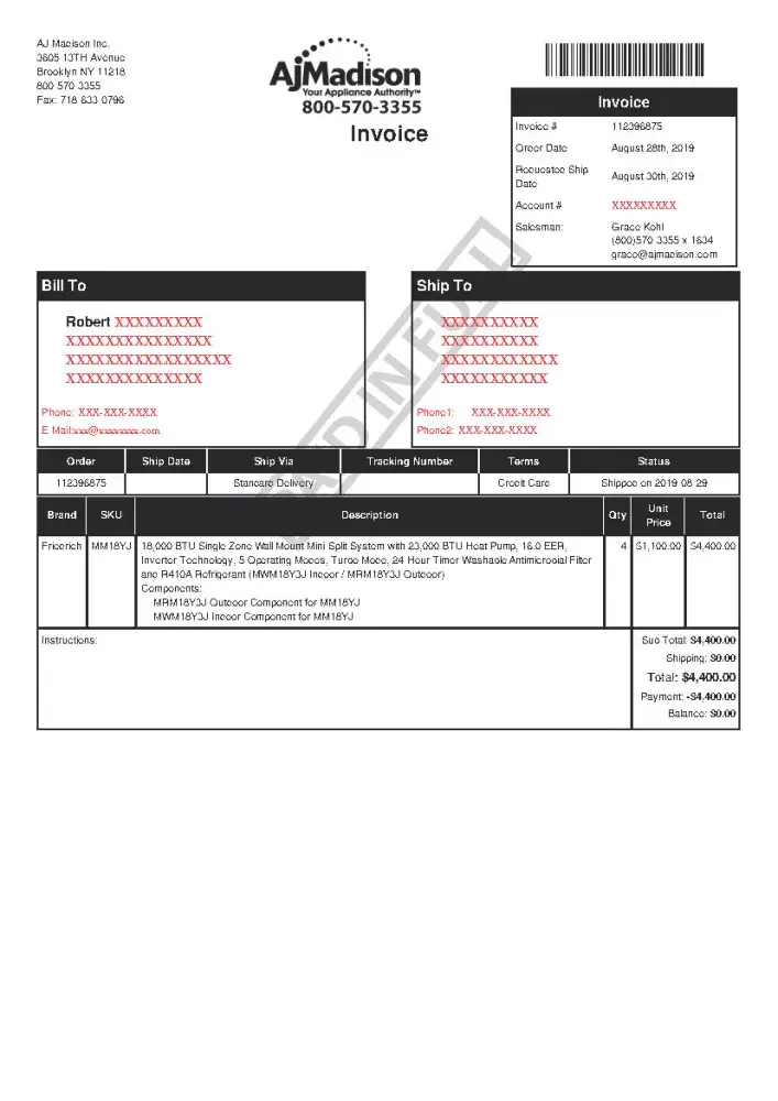 After calling the manufacturer at 10:30am CST today to verify AJ Madison placed my order to be drop shipped, Mr. Joe Guerrero of Friedrich (phone [protected]) stated AJ Madison NEVER placed my order, no PO at all, though AJ Madison states it was placed 8/29/19. The credit card was charged in full, $4, 400.00, on 8/30/19 by AJ Madison.