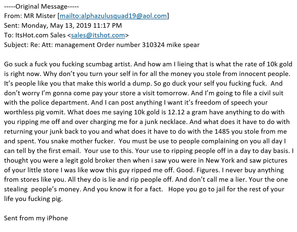 I've worked with ItsHot in the past on an expensive custom piece of jewelry. I had some issues initially because the piece was not made to specification and they were slow to respond, sure I was upset at the time BUT... THEY DID RESPOND and when they did they corrected the issue very quickly and overnighted the piece back to me so I would have it in time AND paid ALL of the shipping fees. The finished piece is perfect, absolutely stunning and constantly gets compliments. There are no issues with the quality or authenticity of the item. Things don't always go perfect, it is unfortunate when they don’t but my experience is they made a mistake and was more than willing to correct it and ensure the customer was happy. As long as they are willing to resolve complaints and use their issues to drive improvement in their business processes, I would continue to work with them. I posted a complaint when this happened to me but I think it is also important they are given credit for resolving issues!