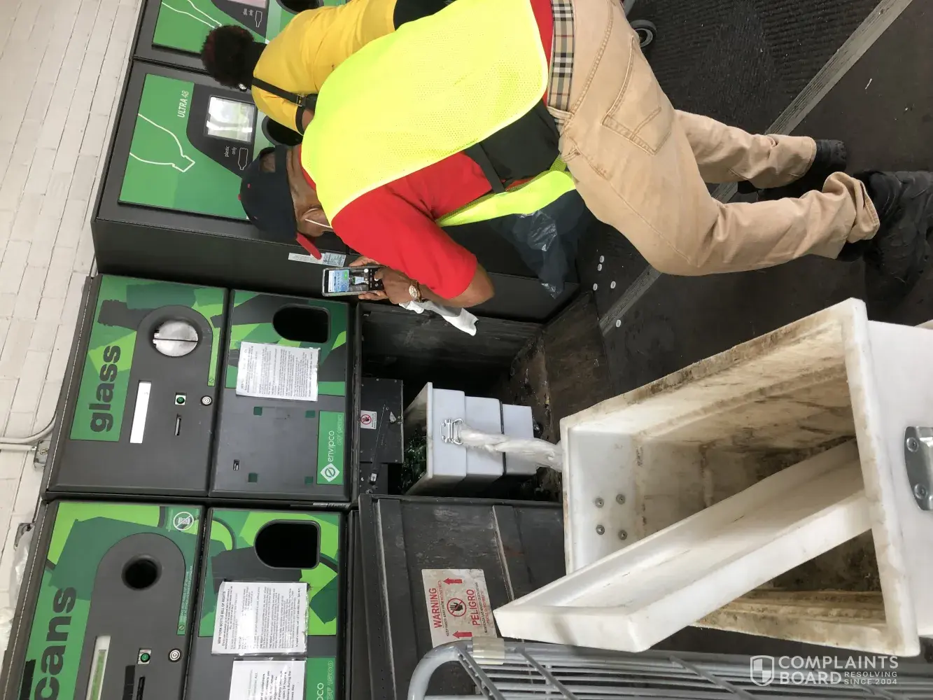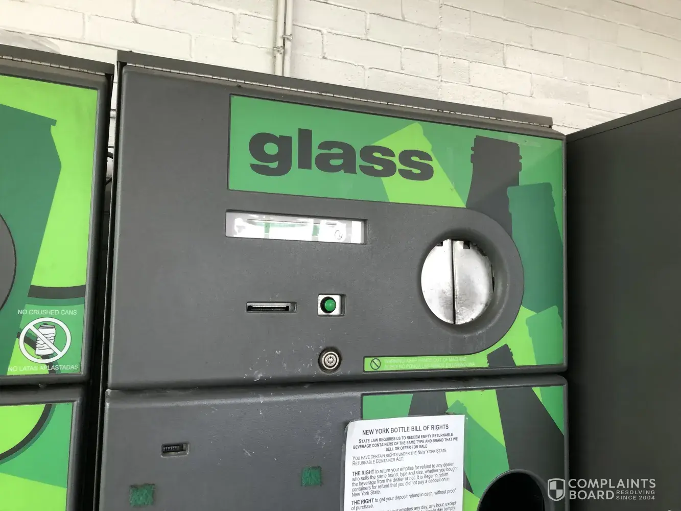 At 8:30 am this morning only one plastic bottle machine working, one can machine working and one glass return that was full. Plus the area was filthy with broken glass, and other debris on the floor. I went to Customer Service and informed the clerk. I was told a call was made and someone was coming. I asked if a second call could be made. It was. After waiting a few more minutes, I asked to speak with a manager. Jose S came and put in a third call. When someone came, Frank S he proceeded to complain to me it was not his job. It took 30 minutes to finally get service. The manager, Jose S, refused to allow the Customer Service desk to take the bottles in the meantime.