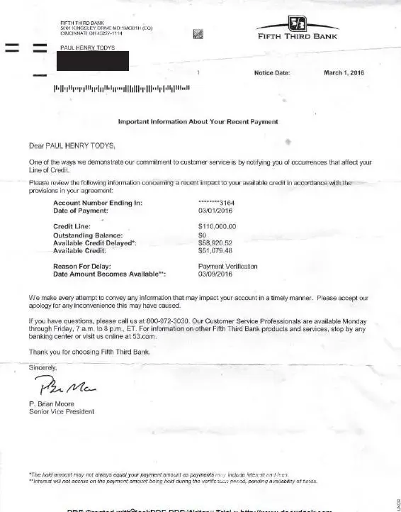 I just received a letter from Fifth Third today telling me that there is a hold for 9 days on my Fifth Third HELOC, as I just paid the outstanding balance down to zero from my Fifth Third business account to my Fifth Third HELOC account. And, I did this in person, at a branch office. Correct me if I am wrong, but this payment transfer was made from an available, verified balance in a Fifth Third checking account to another Fifth Third HELOC account-- both in my name. It's completely an in-house transaction, and Fifth Third writes to me that for "payment verification reasons" the credit on the HELOC will not be available for 9 days. How incompetent does a bank have to be to take 9 days to clear moving money from its right hand to its left hand. If I were to have gone in and asked for the money to be wired OUT-- they would gladly do that instantaneously (for a $30 fee, of course).