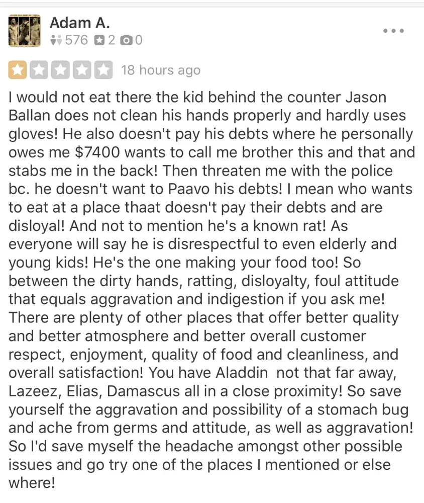 Hilarious this is yelp everything people are saying! So here is more proof for any doubters! Yes sure if u never had real authentic Arabic food you most likely will like it! However there is way better and with less bs and with out the possibility of being disrespected by a rat and liar Jason Ballan! So this is someone else who feels like me on yelp one of the hundreds who have stated this and Souymaya has paid to have deleted and only leave all the good reviews up!