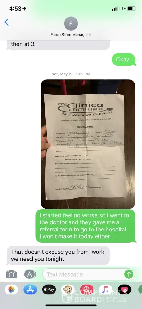 My one-pass coworker tried calling in and had to go to the doctors, and he still tried to make her come in. On another side note, when I asked if another associate could cover my shift, I was met with "managers cannot pick up cashier shifts." However anytime a cashier calls in, even to this day, my girlfriend who is an assistant manager is one of the first people he will text or call to try to cover their shifts. Faron goes back on his word like this often. I would also like to add another occurrence during my employment. When working as a cashier, stocking during one shift, my girlfriend Katie was an assistant manager and on a register. Faron was in the office. Katie was receiving family calls saying that her Mimi had minutes to live so she should call and say her goodbyes. Faron would not let me take her place on the register even though it was not busy at all. By the time she had gotten off the register, her Mimi had already passed away and we were livid to say the least.