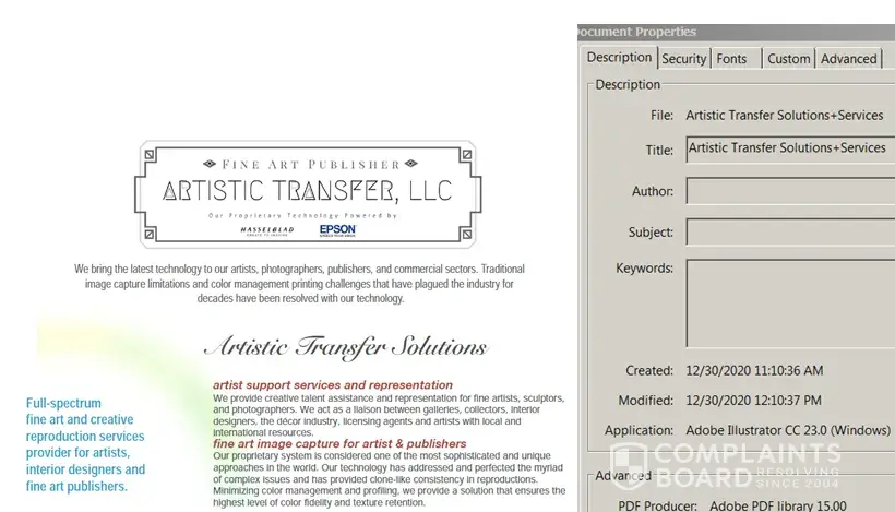 After I was contacted by a representative of Artistic Transfer I downloaded its product services document from its website and learned that it is falsely claiming that it has a "patent-pending system". This document was created on April 10th 2018 and revised on January 26th 2019. As of December 3rd 2020 this false statement has not been removed from its website.