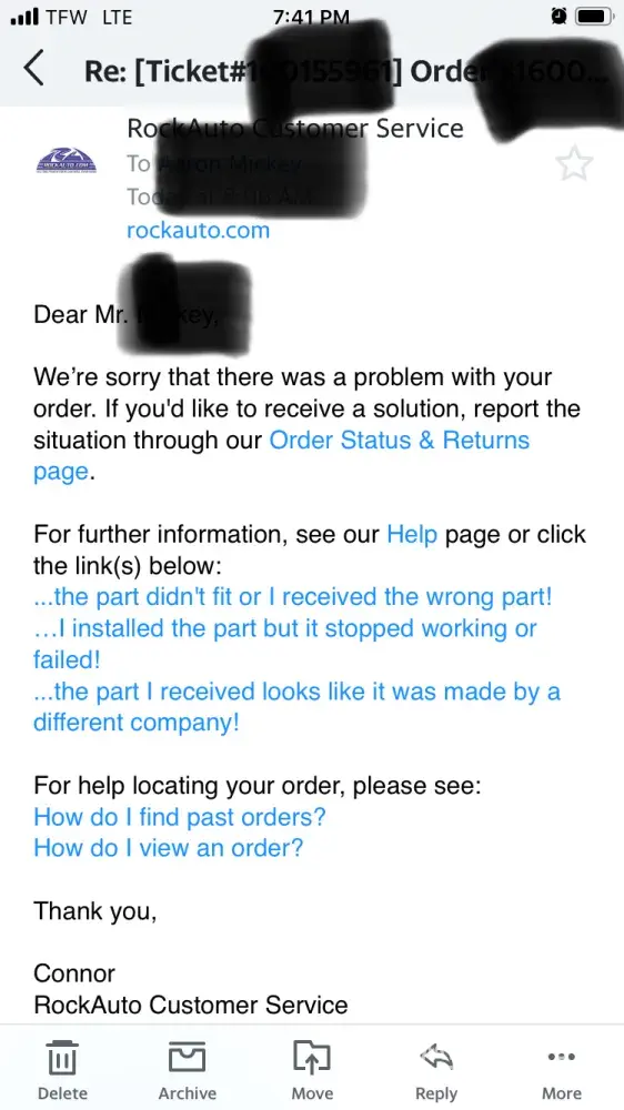 I could not return part because their system would not recognize my contact information (phone number or email address) therefore I could not complete the return process. Rock Auto does not have customer service by phone or email. I could not contact anyone at that company anyway at all.