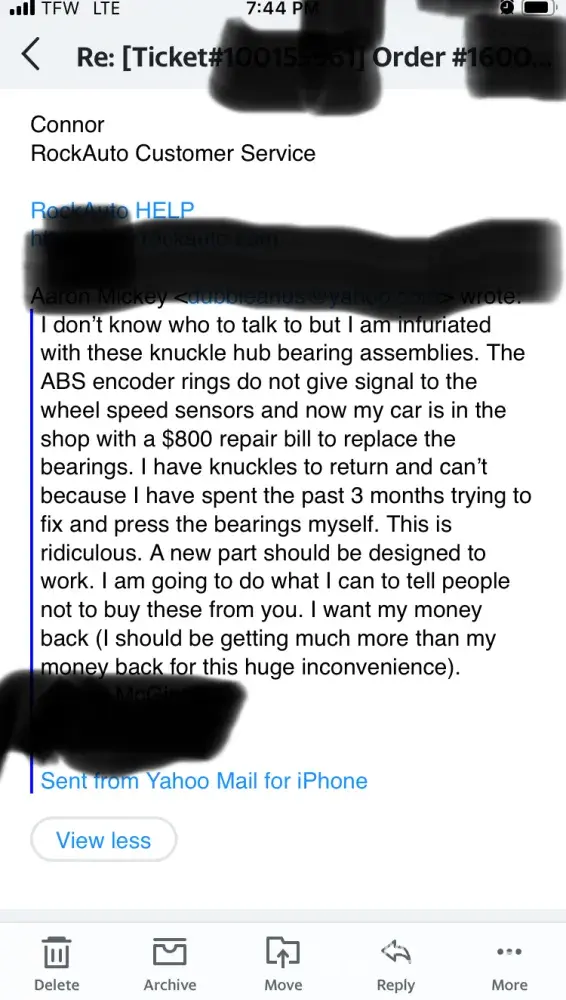 So, you send an email. The response? "Please visit our website and go into our Order Status and Returns page". I also went over 90 days when trying to return the knuckles because of trying to replace the bearings with special tools, something I tried to avoid. None of my tools were working. I spent over $100 in a bearing removal kit and a hydraulic press and couldn't replace the bearings. So I had a shop replace the bearings and it cost me $700. Now since I am now over 100 days returning is not an option, which brings you into a vicious loop of repeating ways to continue to talk to a real person. And getting nowhere.