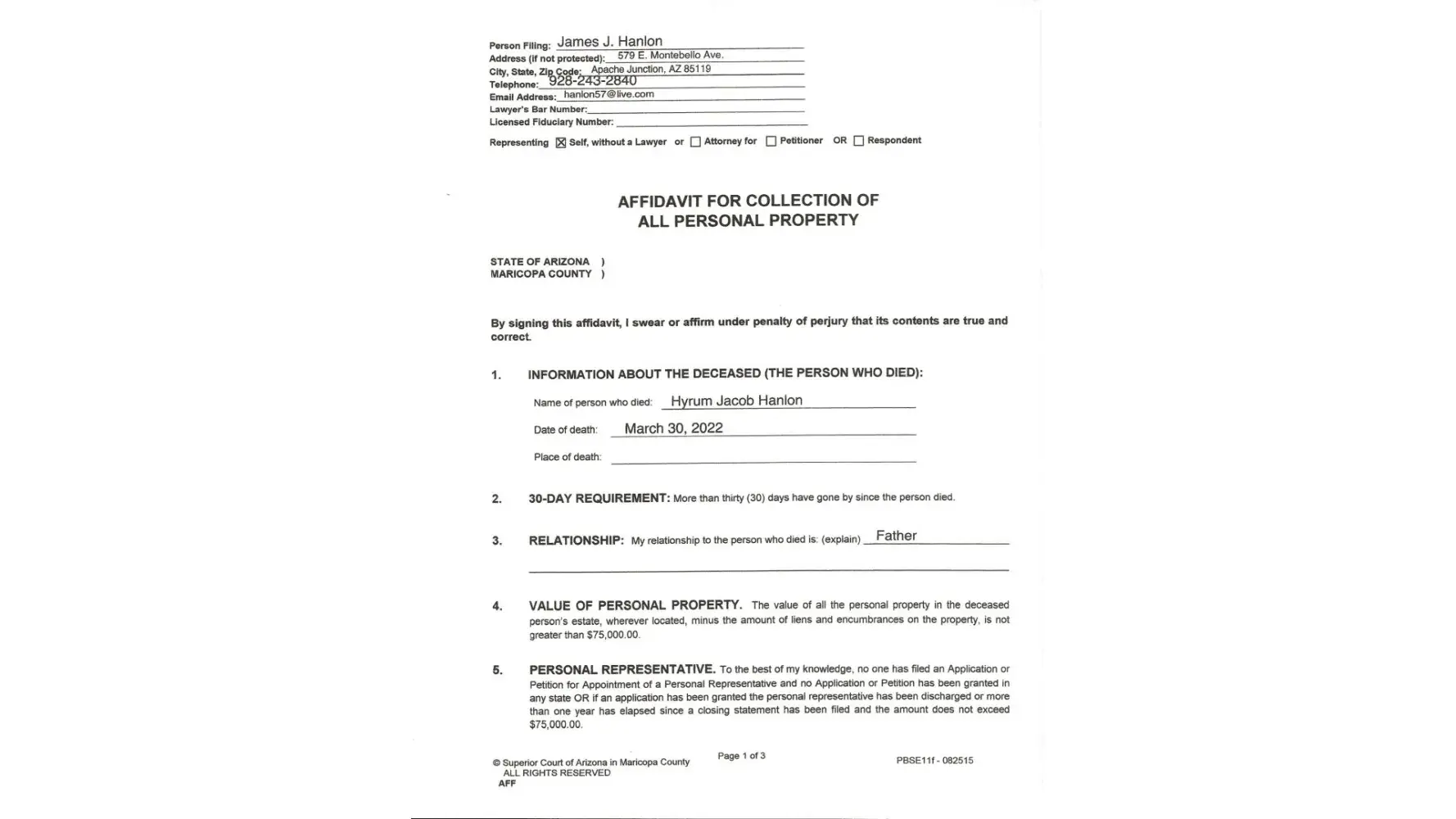 I provided your Survivor Relations Team with the documents they asked me to send to them. However, the Affidavit for Collection of All Personal Property which I gave them did not list USAA as an organization holding Hyrum's personal property. At the time I prepared and signed that Affidavit, I didn't know Hyrum had any financial accounts at USAA.