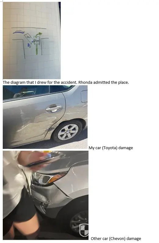 I am writing to file a complaint against Rhonda (the adjuster) from USAA Auto Insurance Company regarding Accident Claim #[protected]-800. On August 26, 2023, a car accident occurred in a garage when another vehicle collided with mine on the driver's side. Both cars were making a right turn, but the other vehicle had a yield sign. I had a right-turn sign...