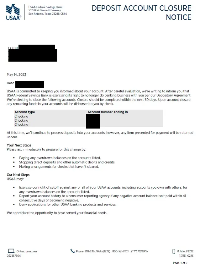 I had nothing but good service with USAA and would have loved to remain a customer, but my accounts were closed, and a letter (email) was sent stating that I was no longer a valued customer and USAA had determined that I would no longer be a customer. Meanwhile, my accounts were still closed pending investigation. After two months, I called to find out the status of my account and was told that I would have to wait, and the agent was unsure when the remaining funds would be mailed to me. I was upset and asked to speak to an on-site supervisor and was told that no one on the site has any more information than he has. I would not take no for an answer, so about 20 minutes later I spoke to a lady that was much calmer and more pleasant, than the male agent. She told me that I would have to wait about two more days and my check should be there in about 7-10 business days. She was on the mark and received the checks as stated.