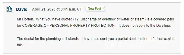 USAA has acted in bad faith for duration of insurance claim, admittedly ignored all attempts at correspondence for 2 months. Redirected claim through 19 different adjusters. #18 pointedly lied to me about my legal options,length of claim, shamed me for not being able to find a contractor, took 2 months and 400 emails to get the name of a supervisor