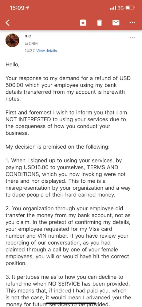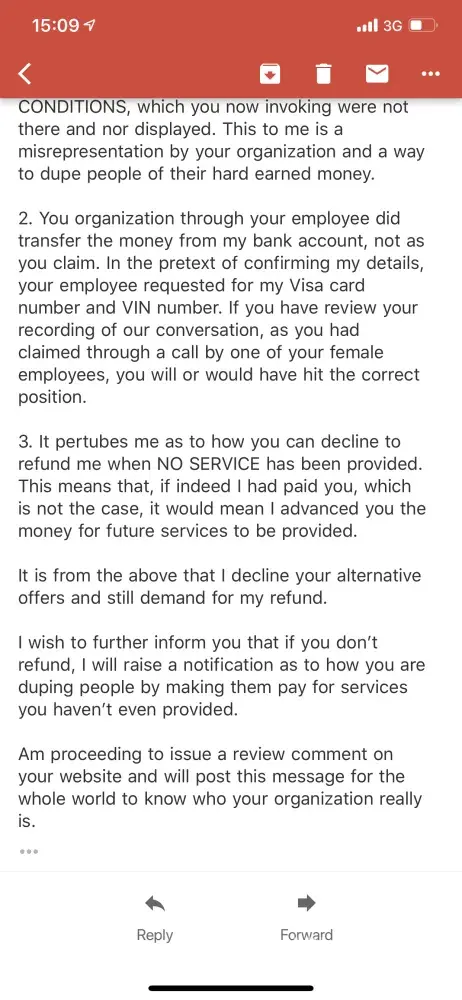 6. I directly wrote an email to Jeff.[protected]@pro-immigration.email asking to refund my money with amount $15 + $ 1157, and after some email discussion, he said the customer services will call me for that. No one calls me after that.