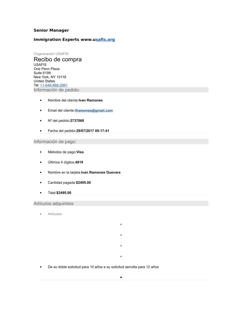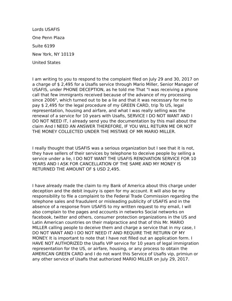 July 29 and 30, 2017 on a charge of $ 2, 495 for a Usafis service through Mario Miller, Senior Manager of USAFIS, under PHONE DECEPTION, as he told me that: "I was receiving a phone call that few immigrants Received for the advance of my processing since 2006, "and it turned out to be a lie or deception and it was necessary for me to pay $ 2, 495 for the legal procedure of my GREEN CARD, travel to the US, legal representation, housing and airfare.
