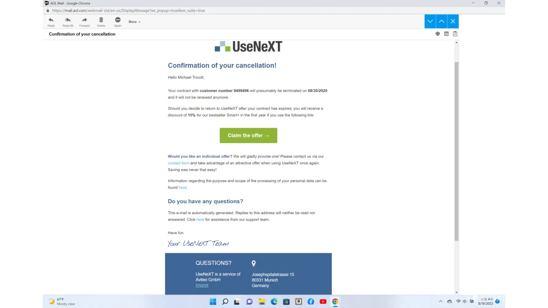 However, since we highly value customer satisfaction and are constantly trying to make our service as easy and transparent as possible, we would like to ask you to send an e-mail describing your problem to notice@usenext.de. We will then try to find a satisfactory solution.